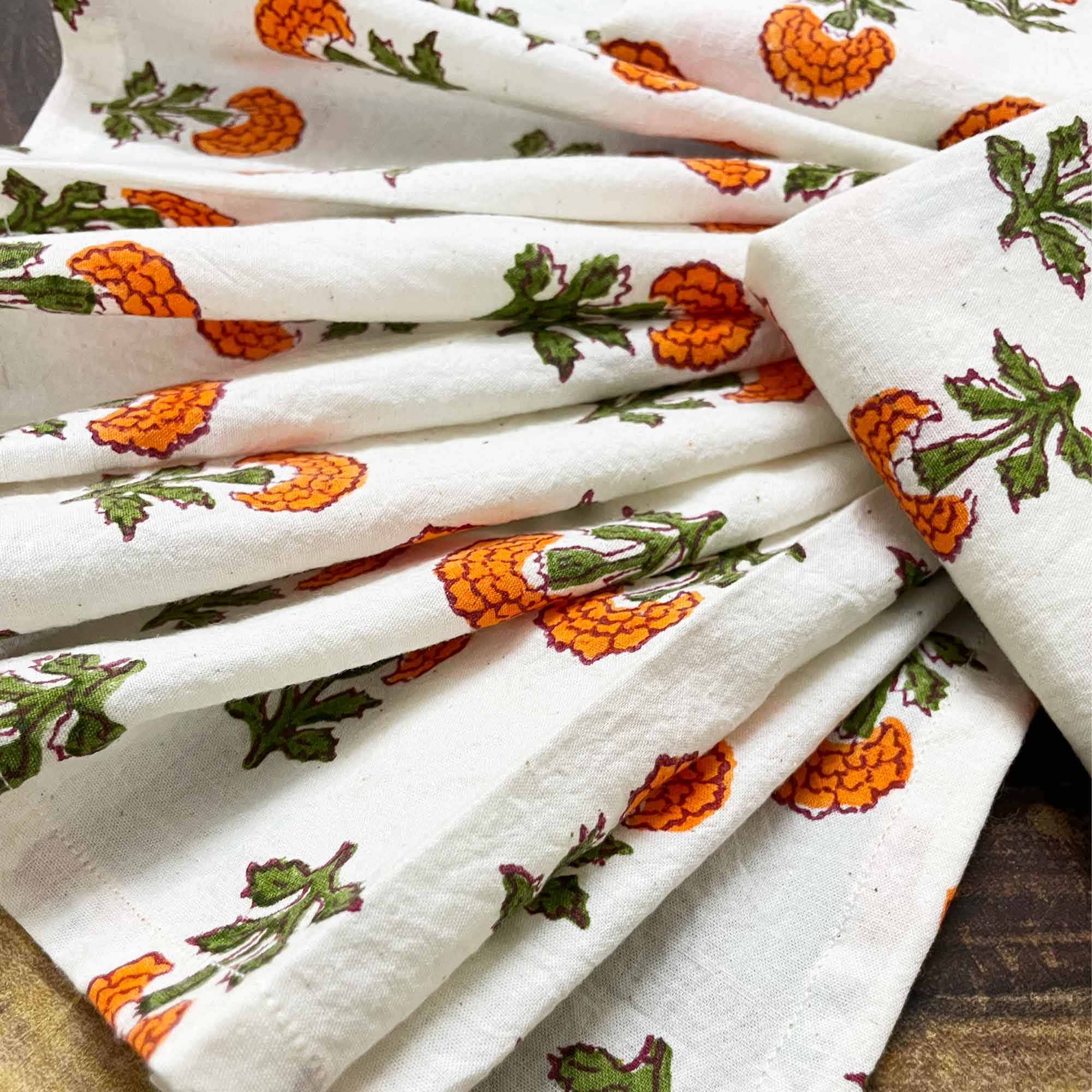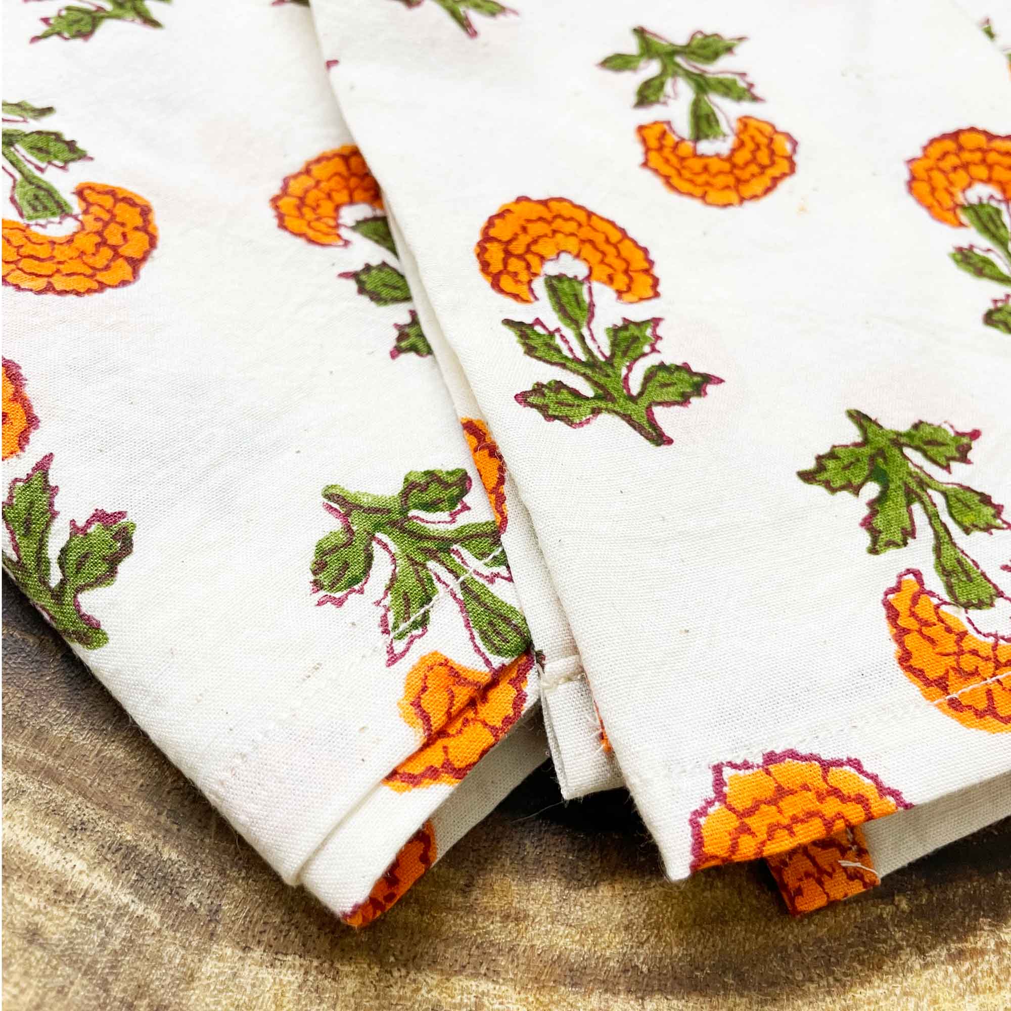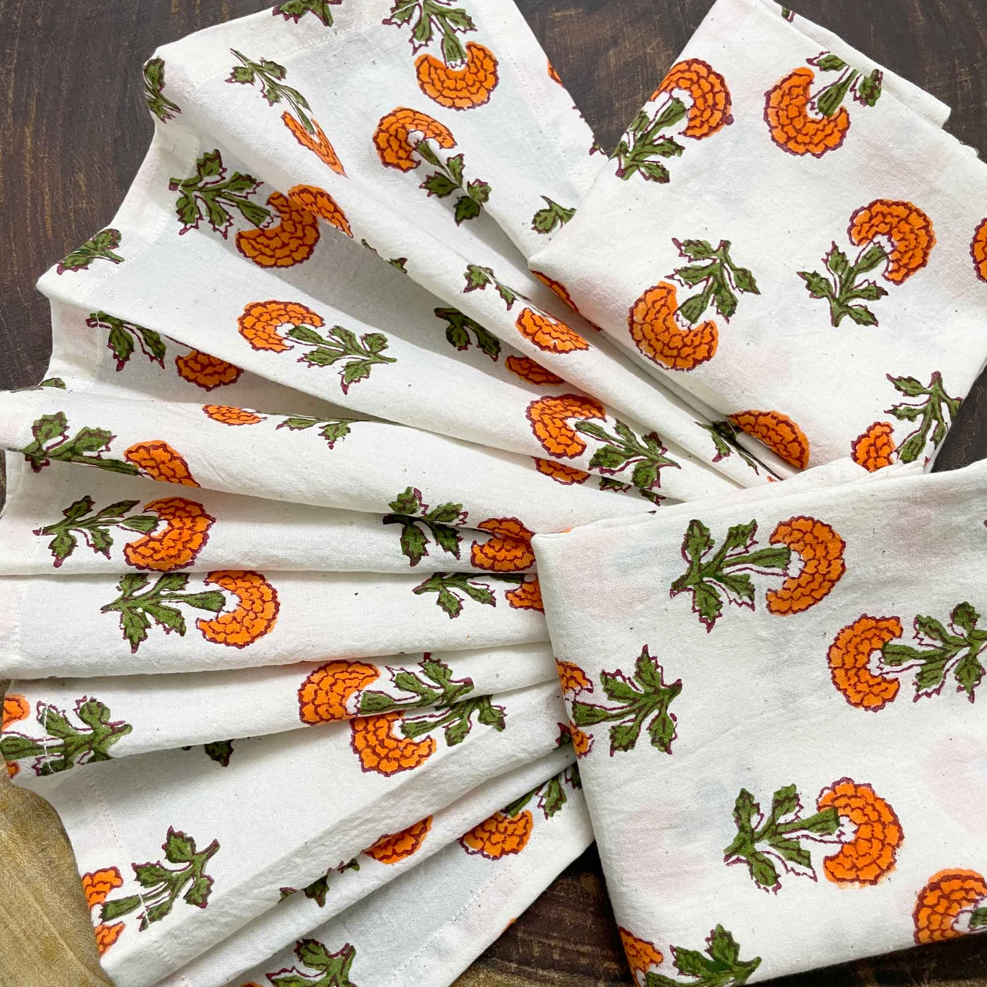 Beautifully hand block printed cotton napkins in Orange Marigold print, made using unbleached organic cotton from South Indian State of Tamil Nadu.
