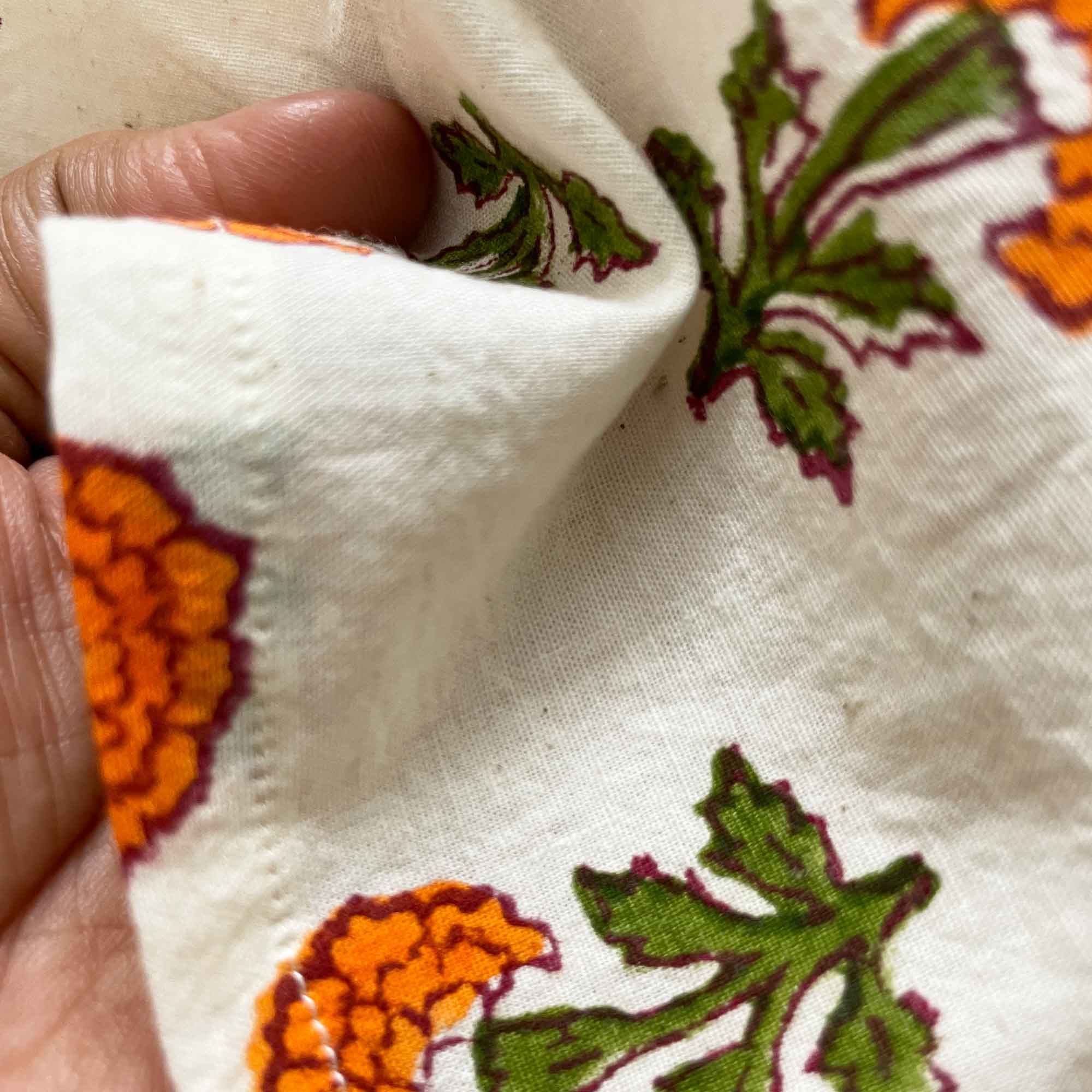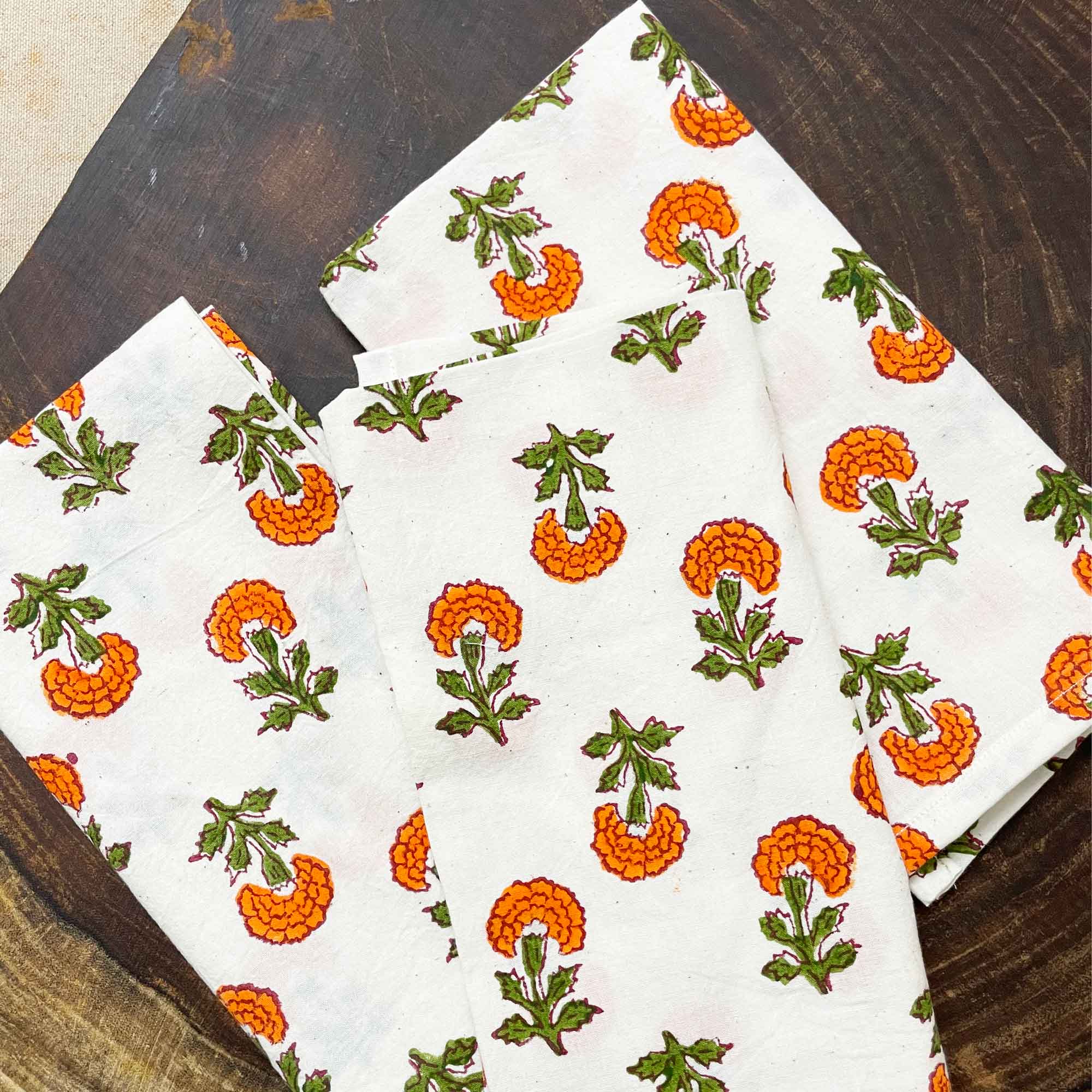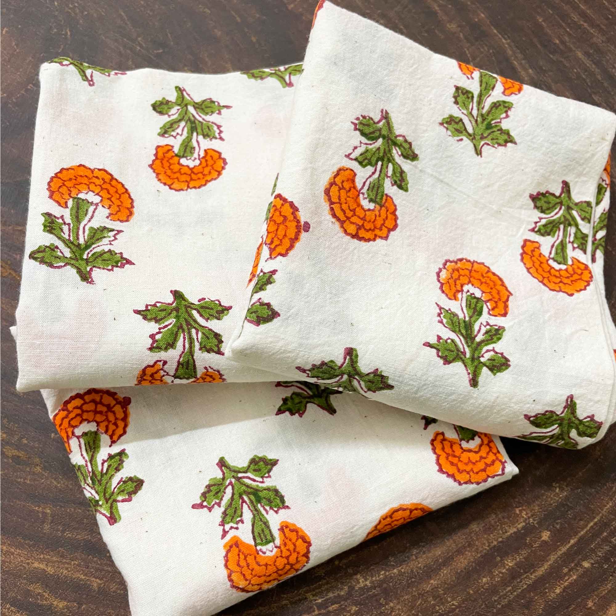 Beautifully hand block printed cotton napkins in Orange Marigold print, made using unbleached organic cotton from South Indian State of Tamil Nadu.