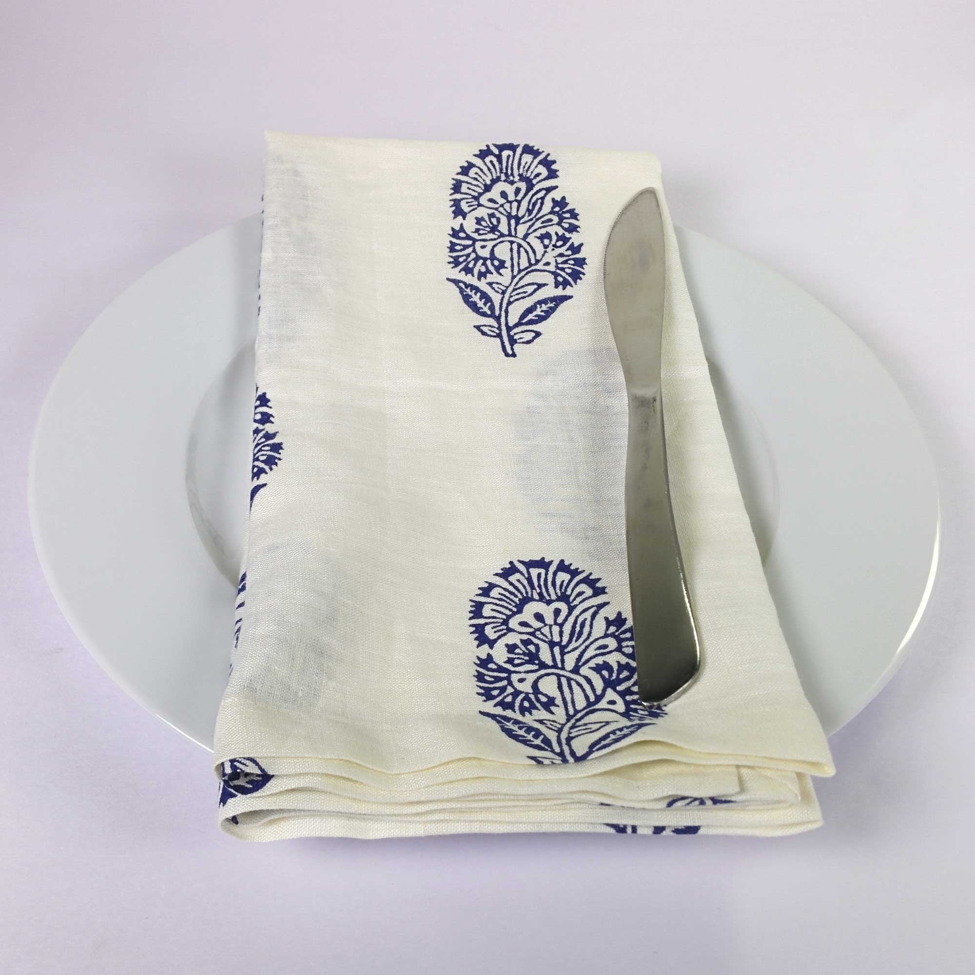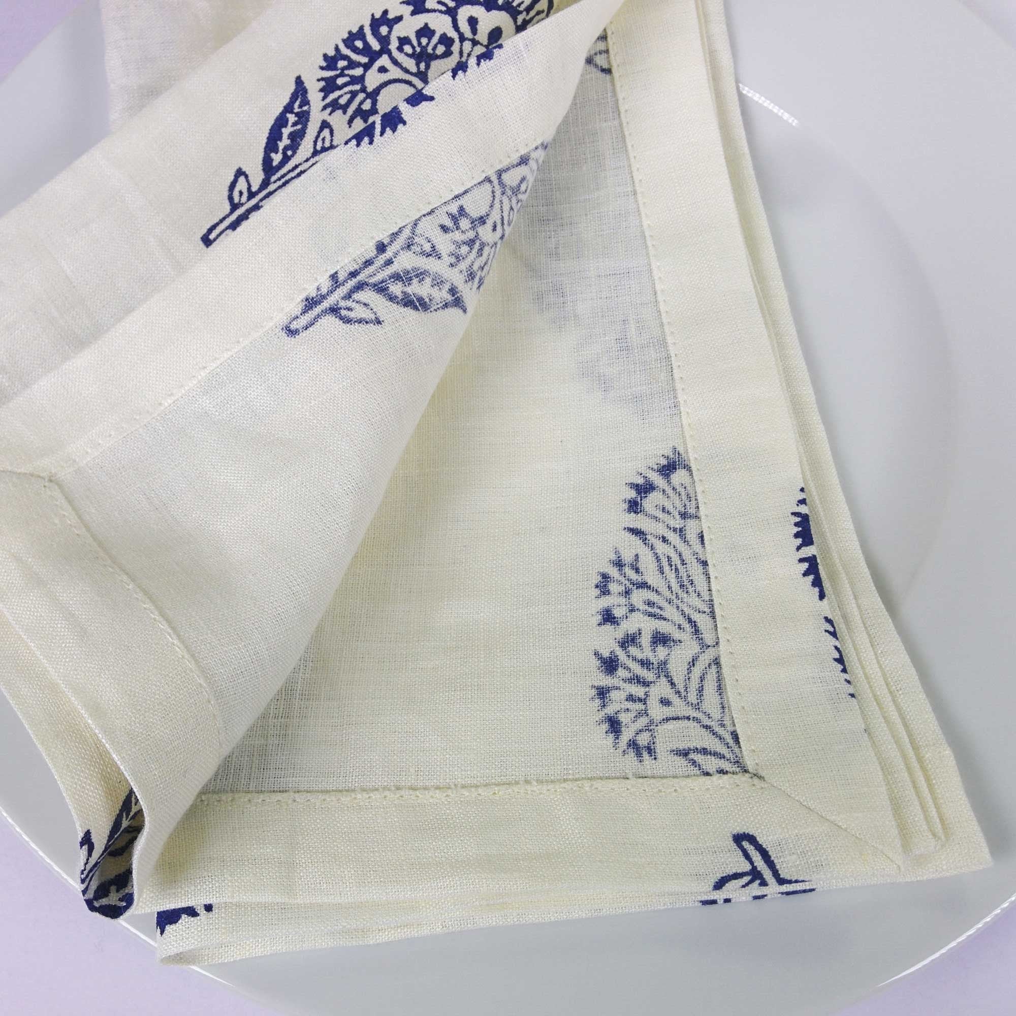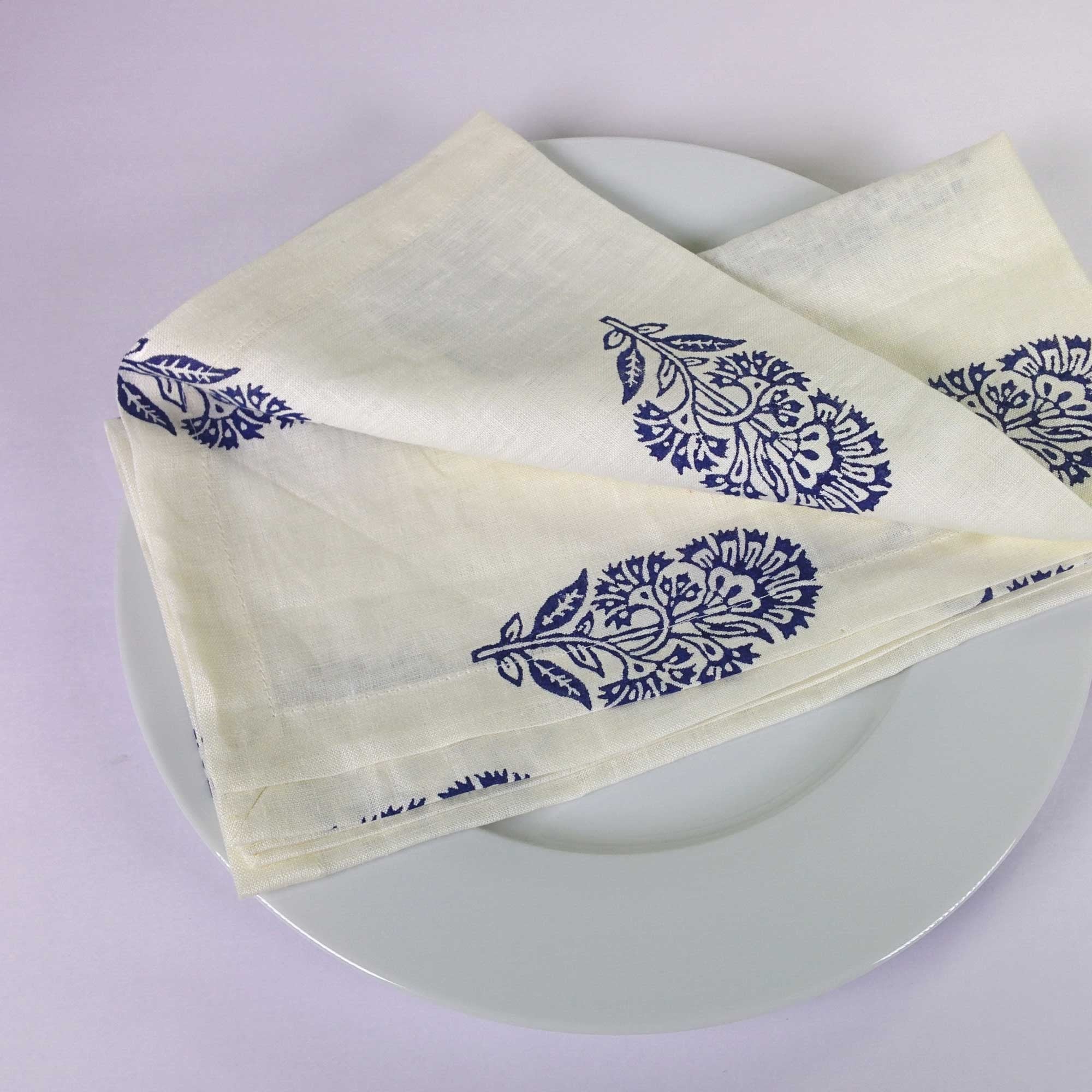 Set of two 100% pure linen fabric napkins in Kashmir Flower print in Indigo.