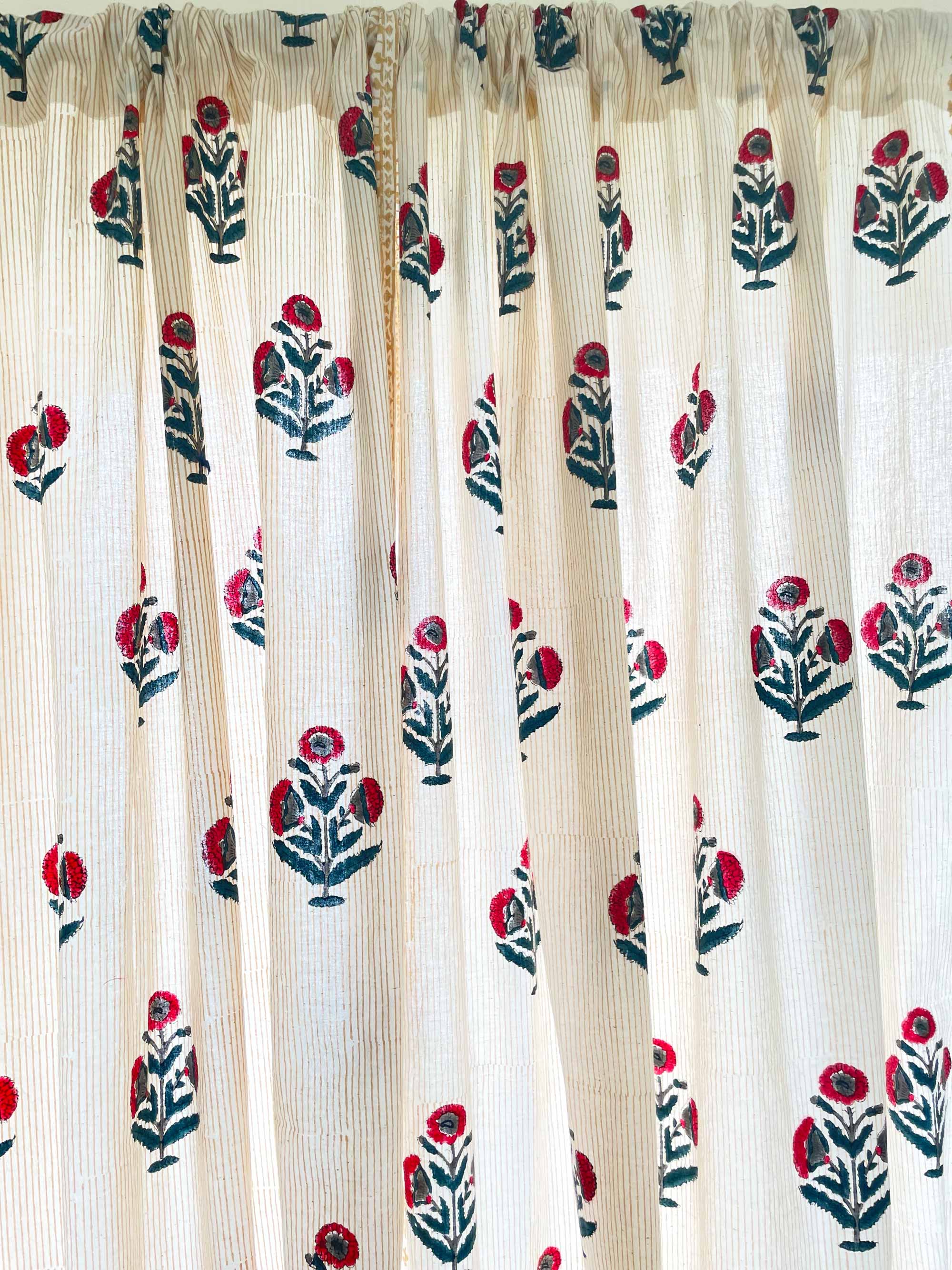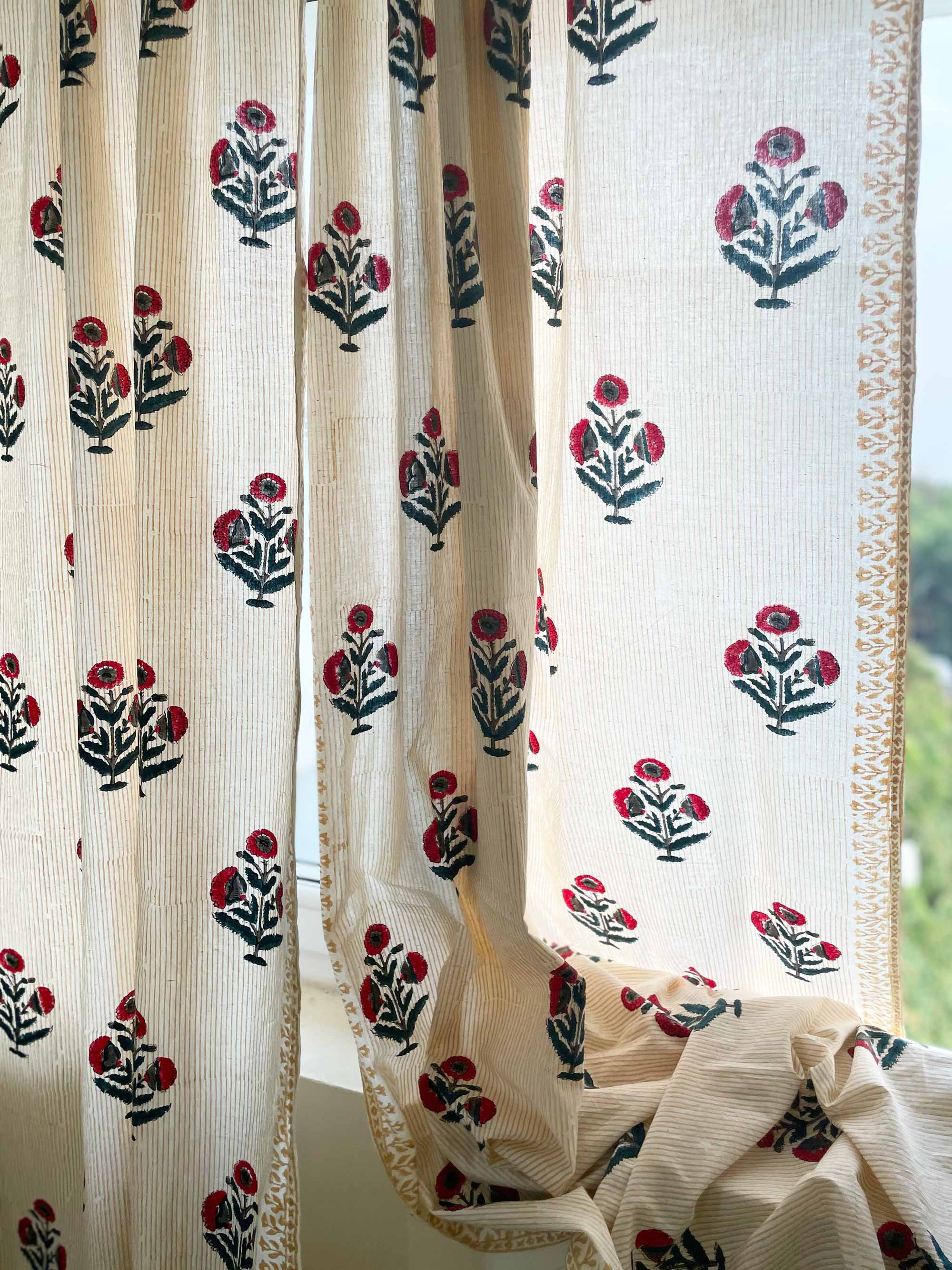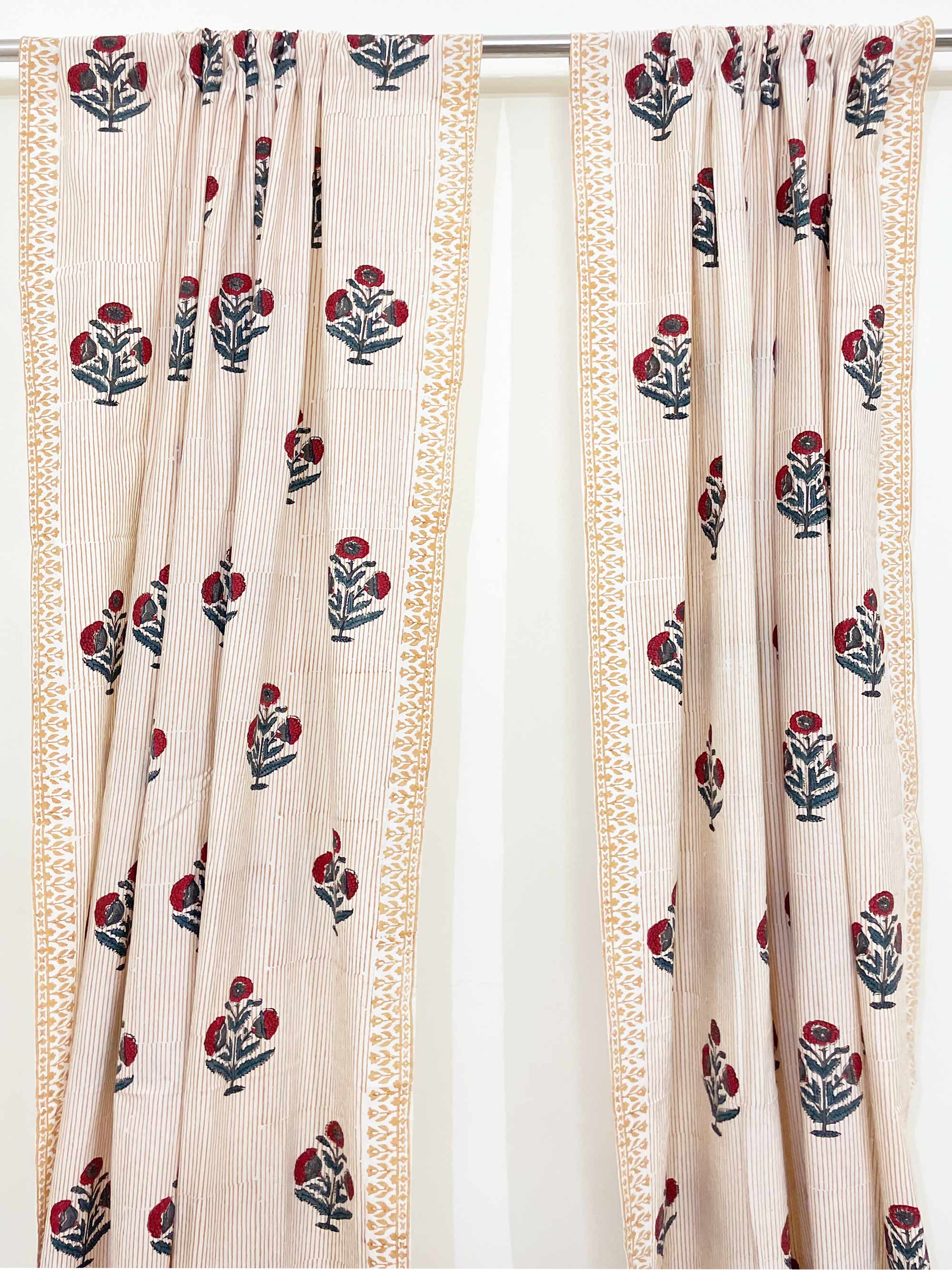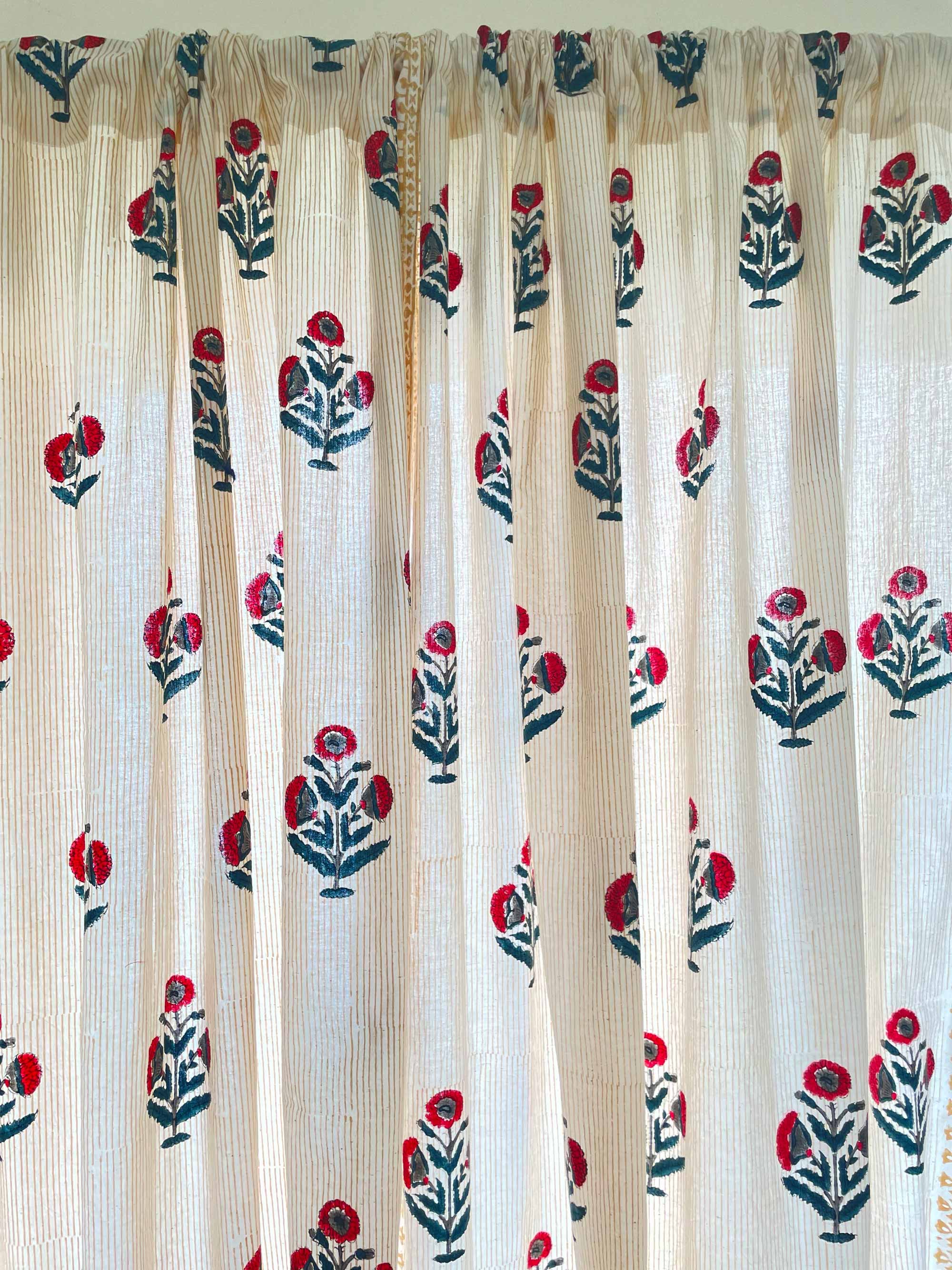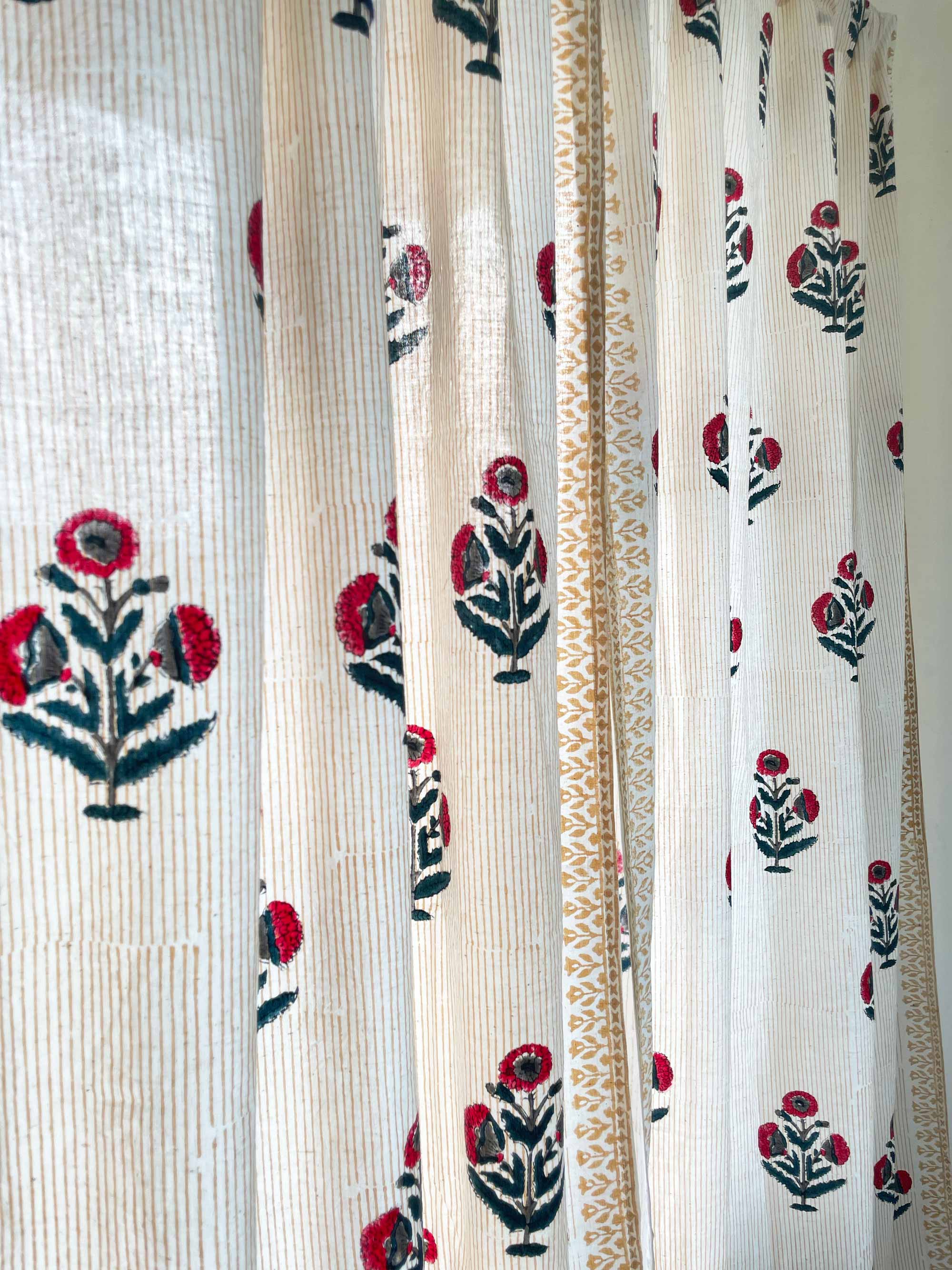 Red and Blue Poppy Hand Block Printed Curtain Panels