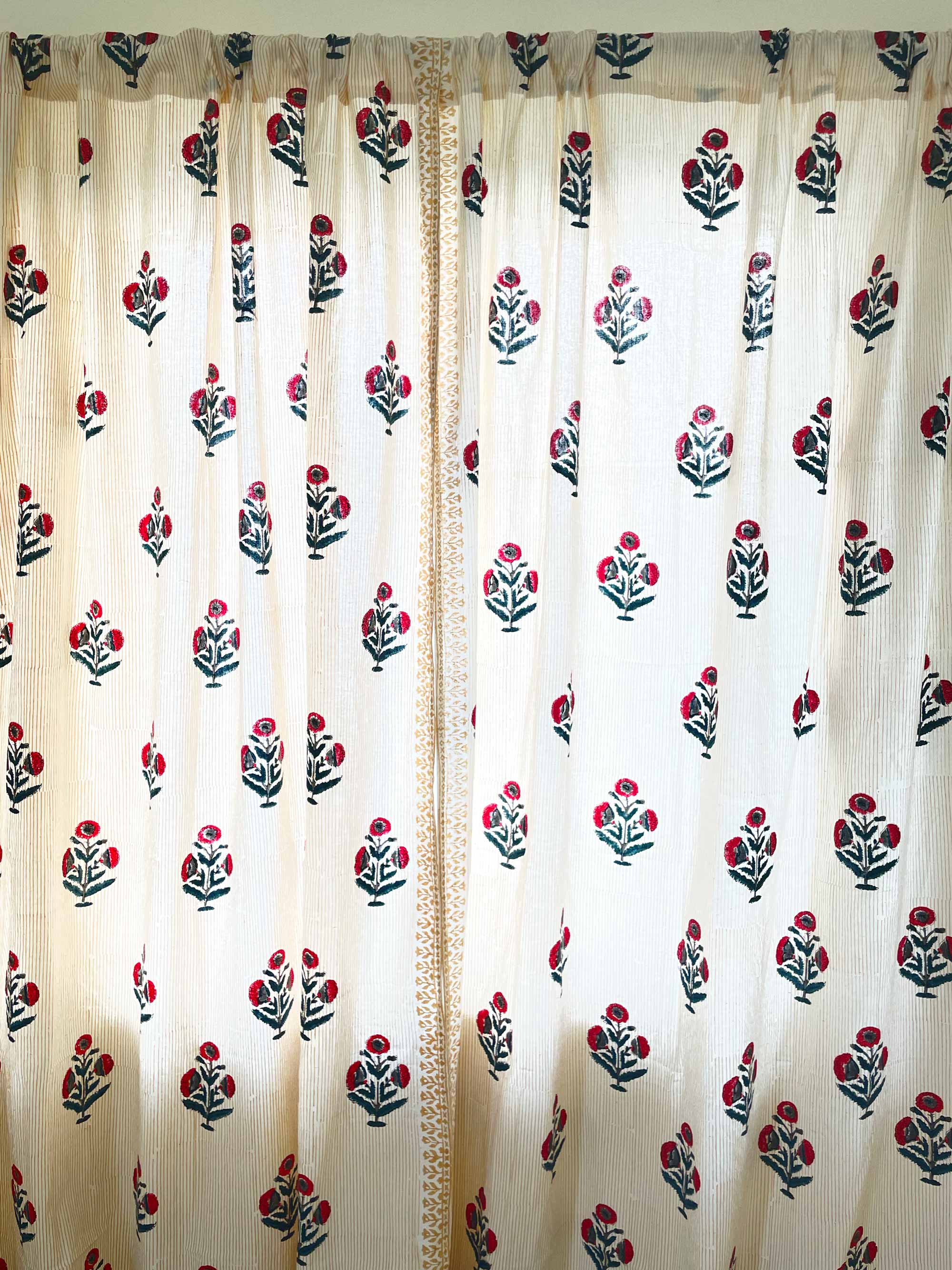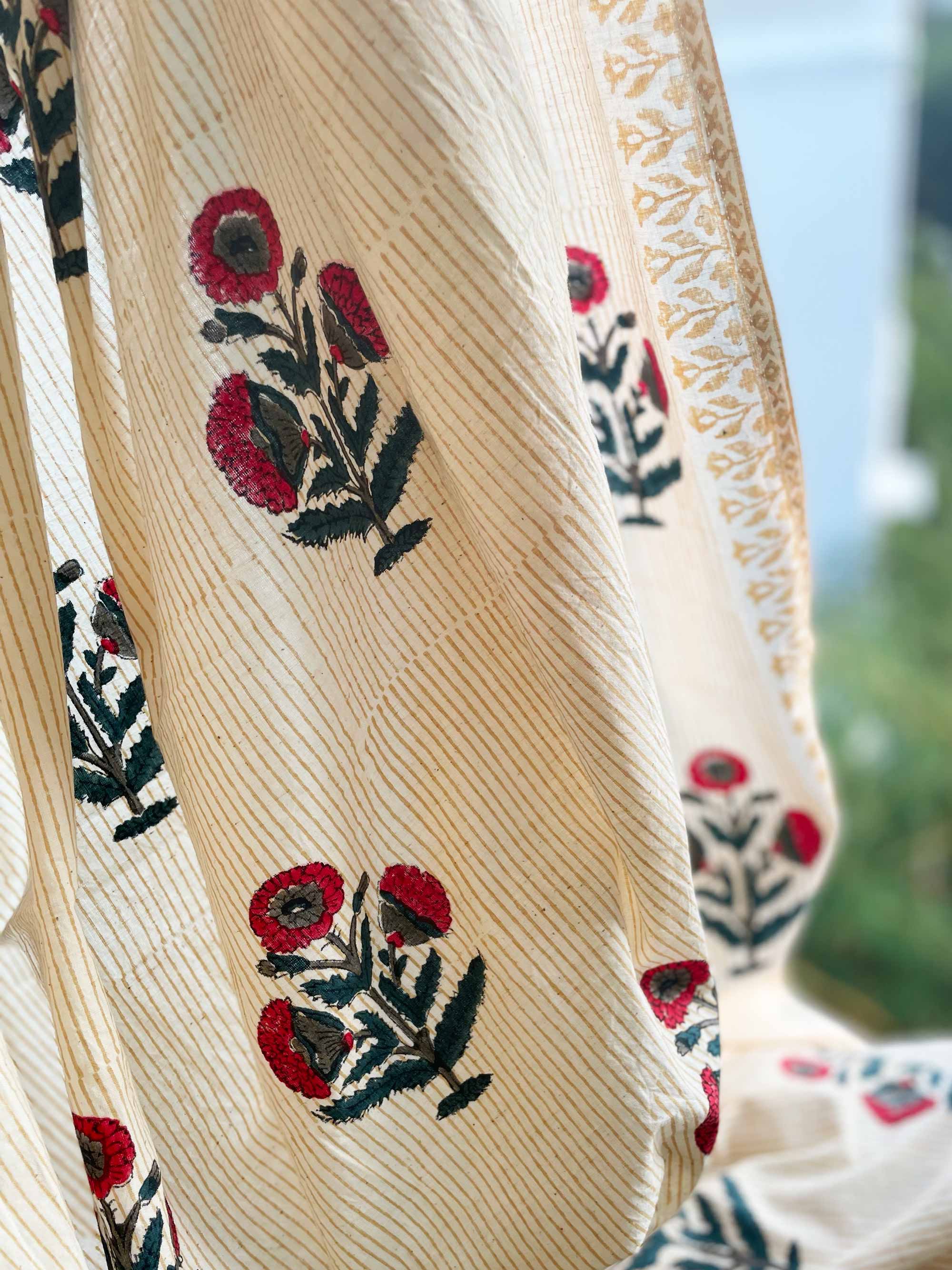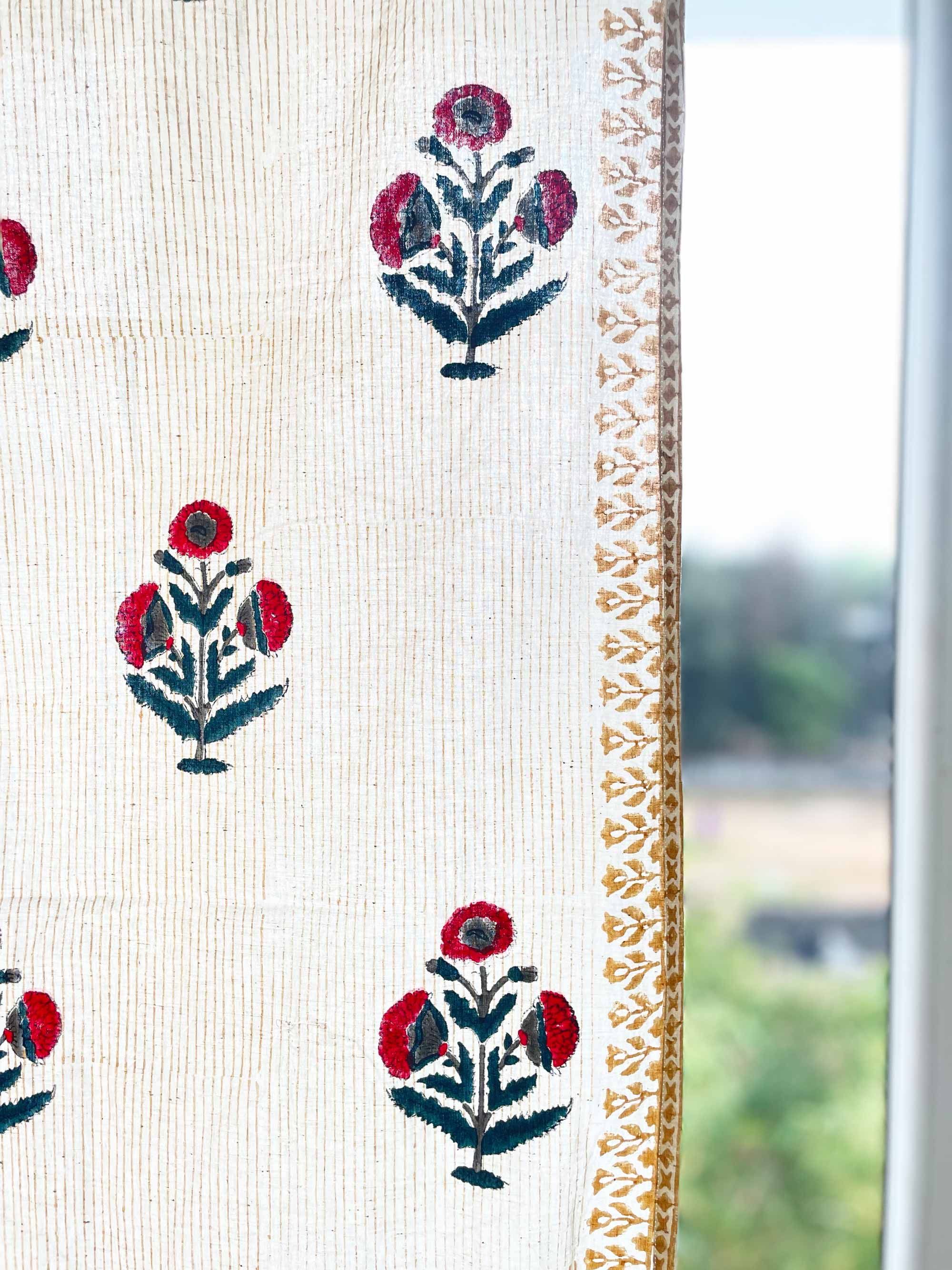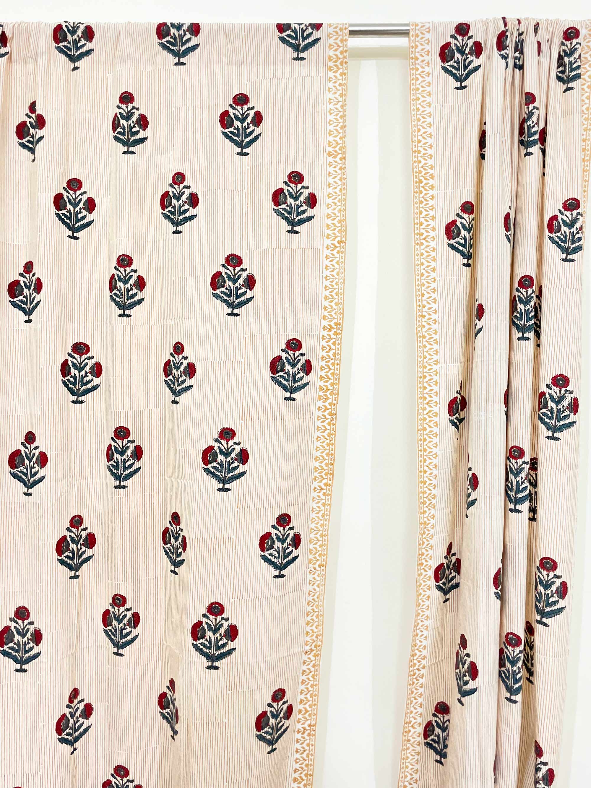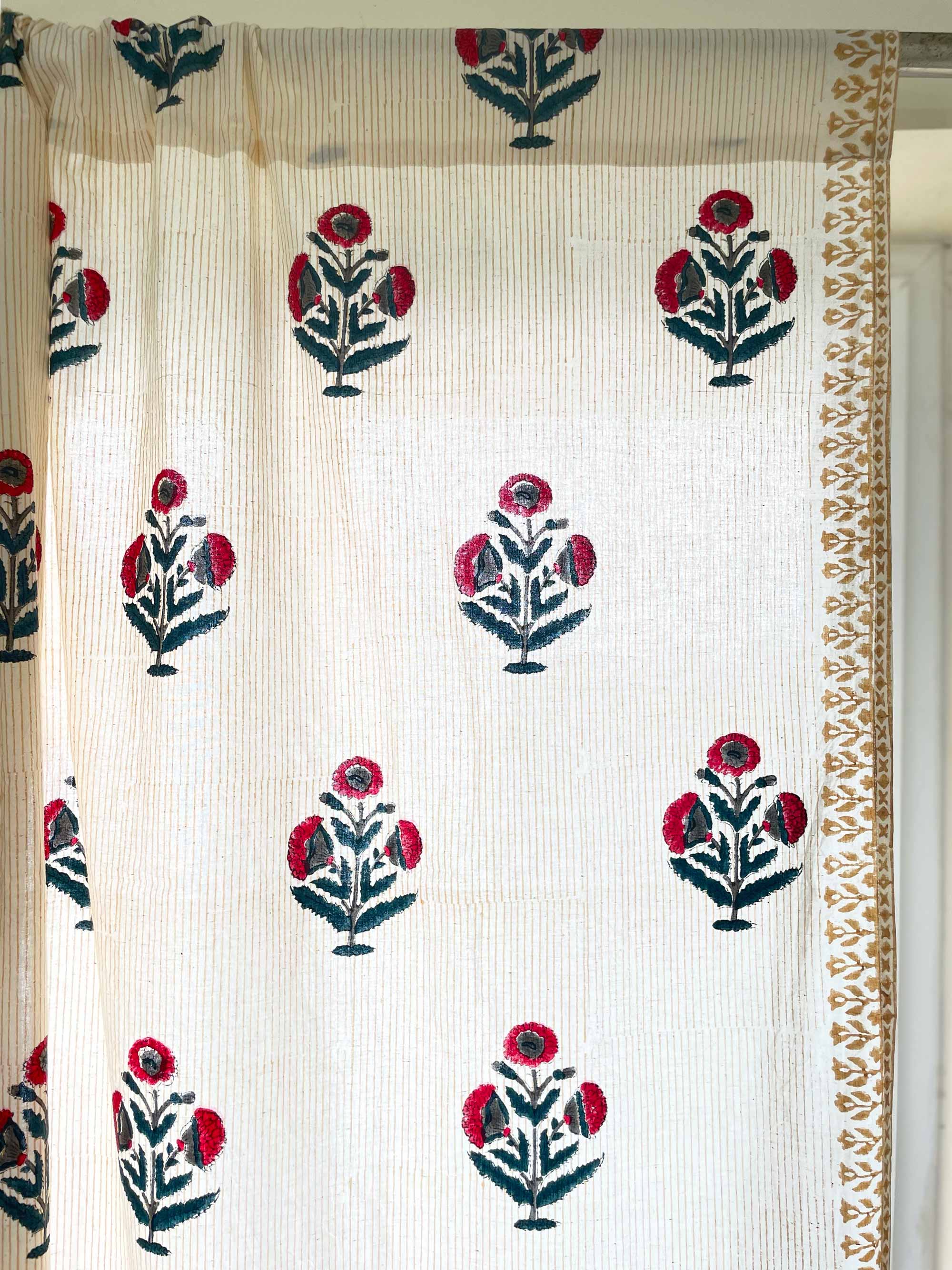 Red and Blue Poppy Hand Block Printed Curtain Panels
