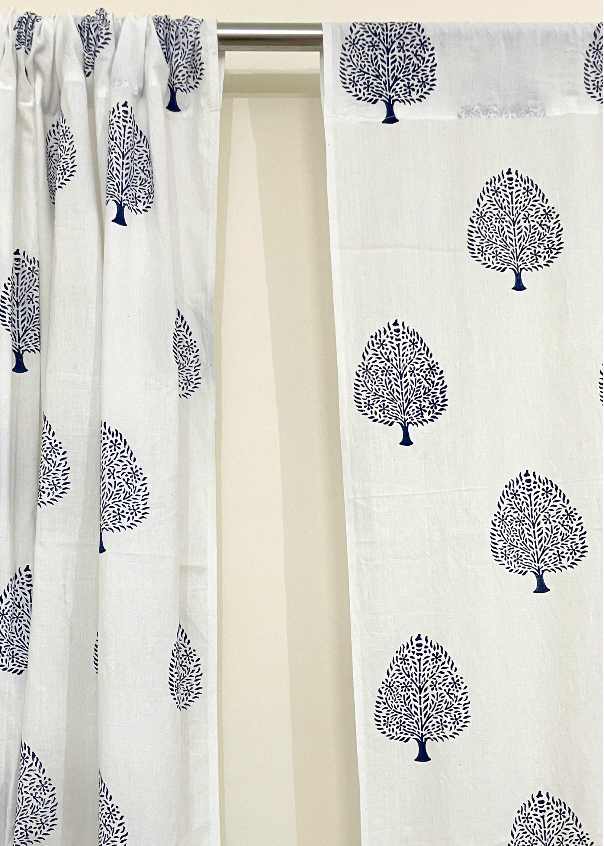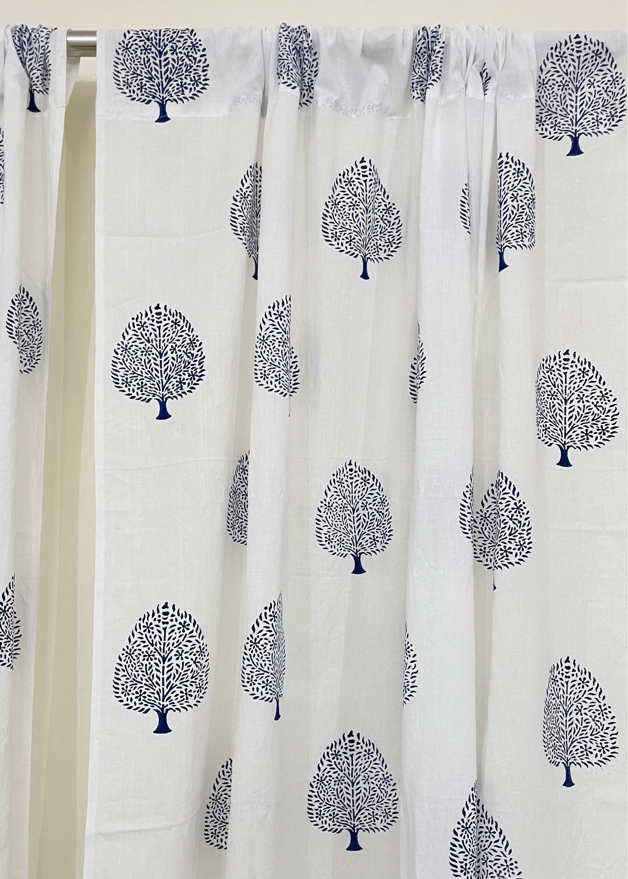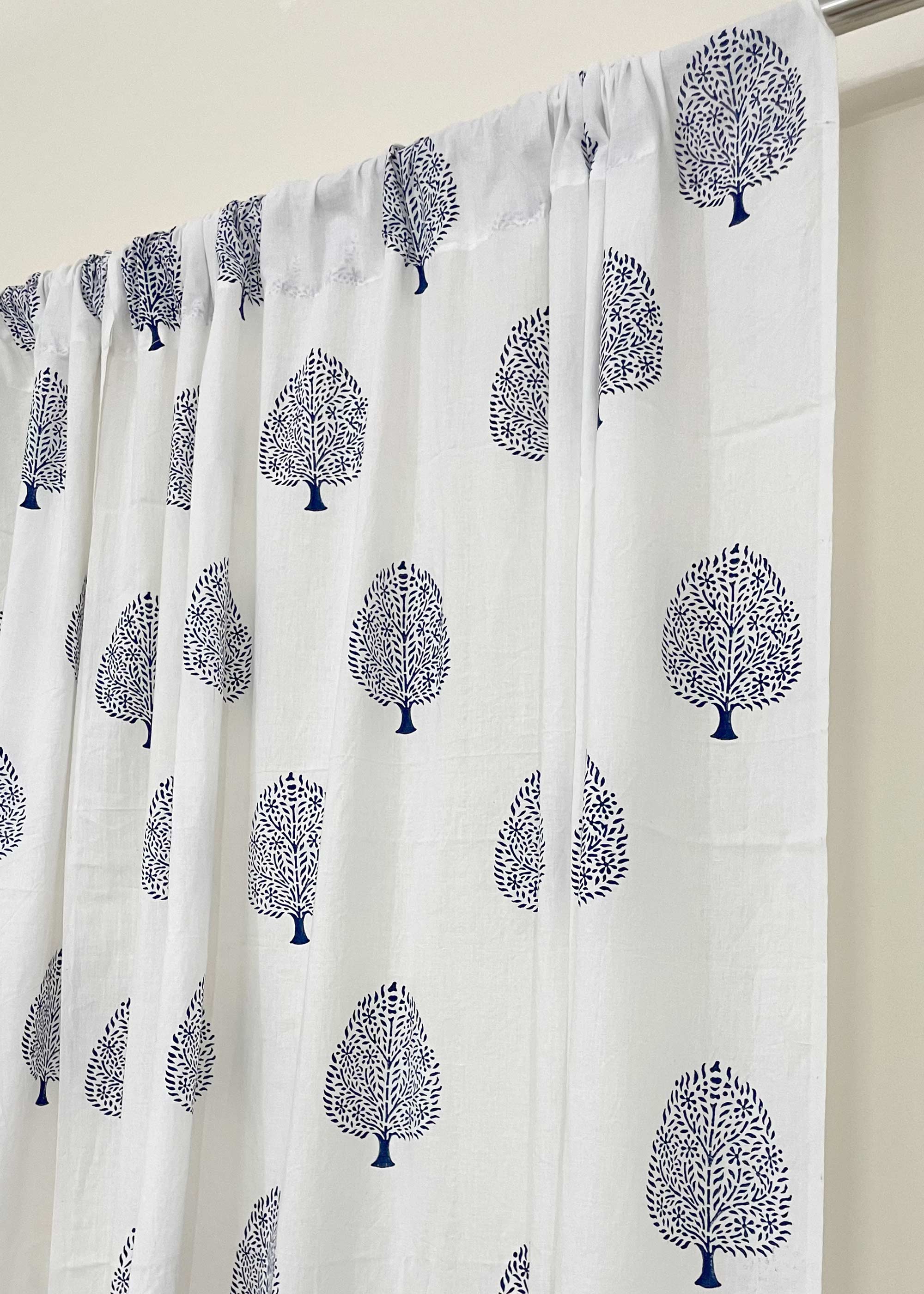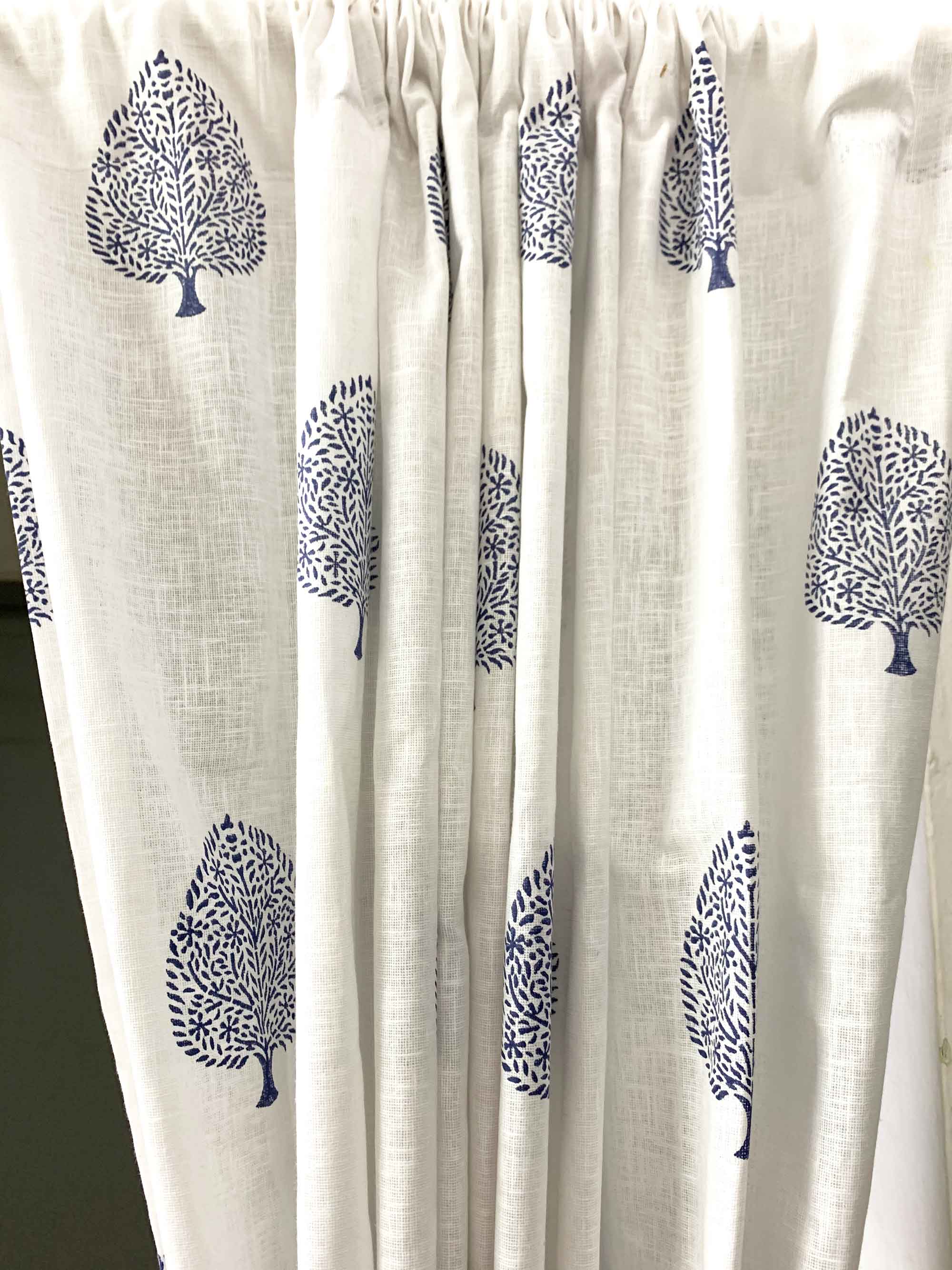 Introducing the Tree of Life Hand Block Printed cotton curtain panels. These beautiful curtains feature a vibrant indigo Tree of Life design on a crisp white background, hand block printed on a soft cotton organic fabric.