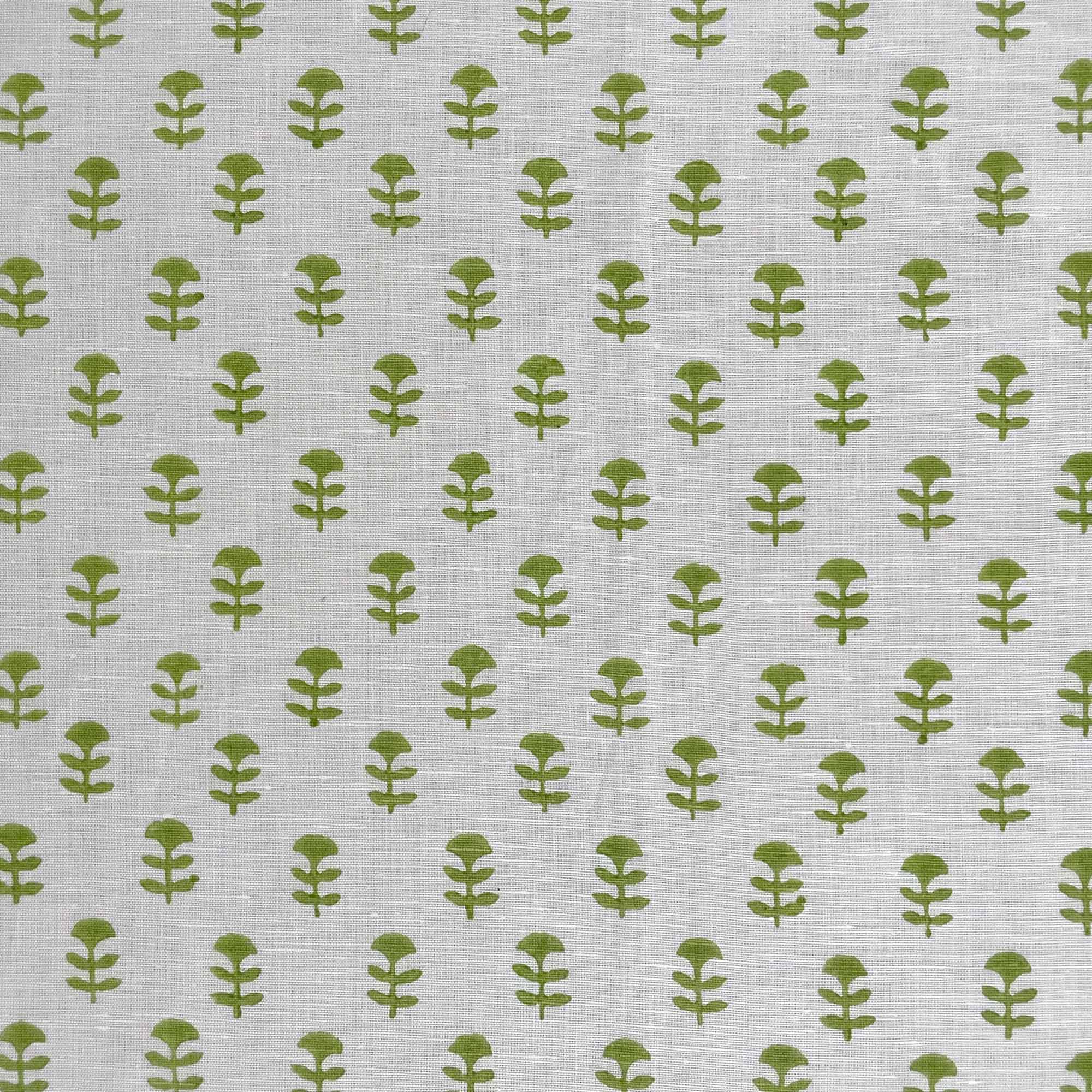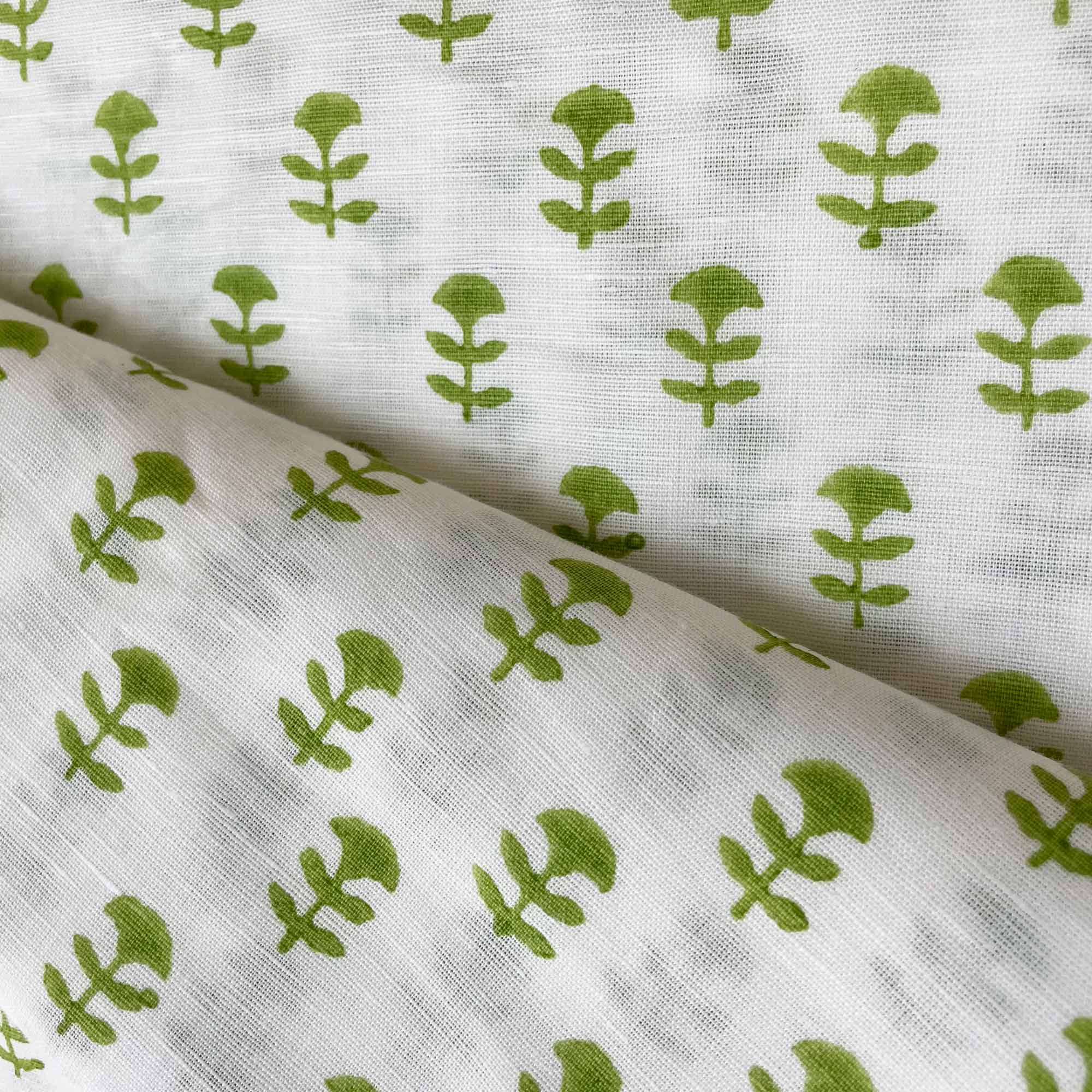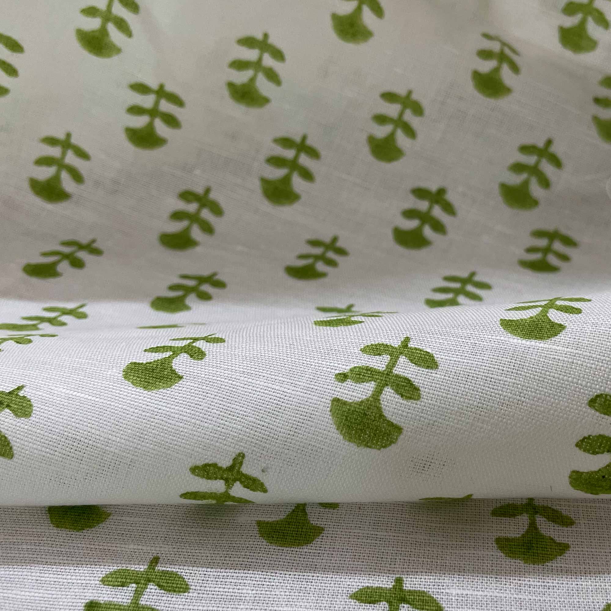 Off White linen fabric with Sage Green tiny flowers printed on it.  The fabric is hand block printed one wooden block at a time.