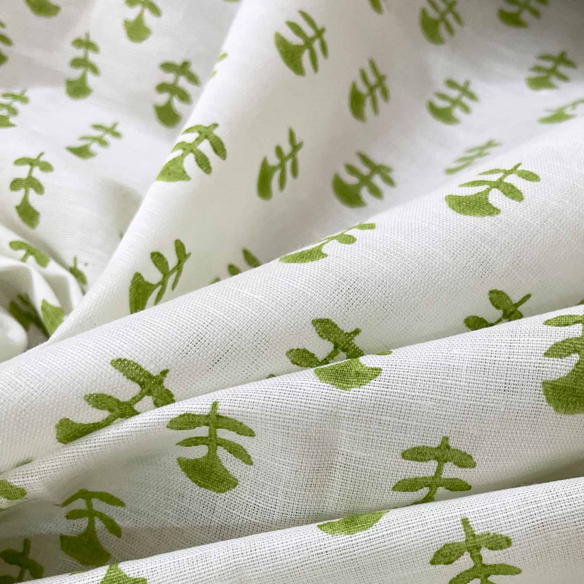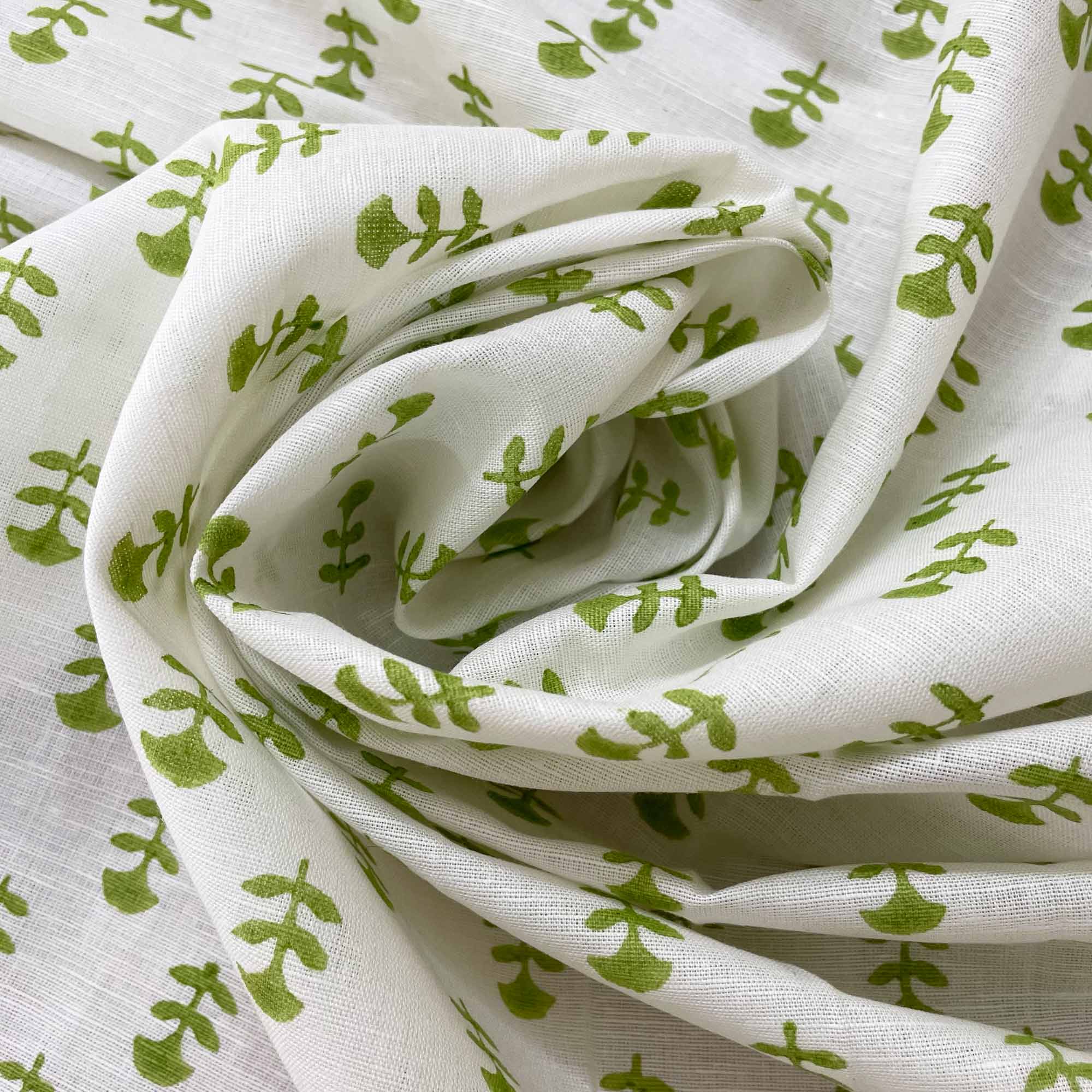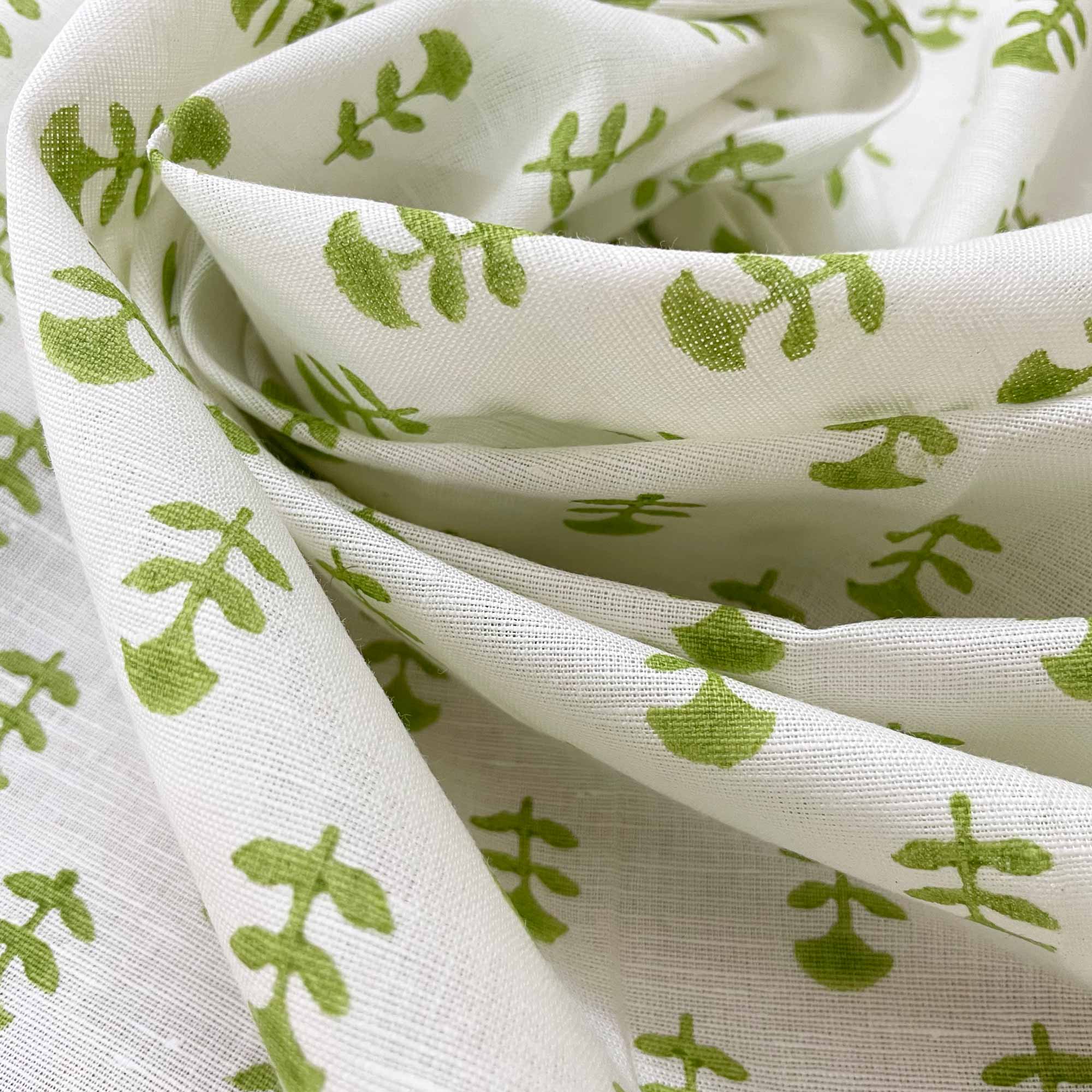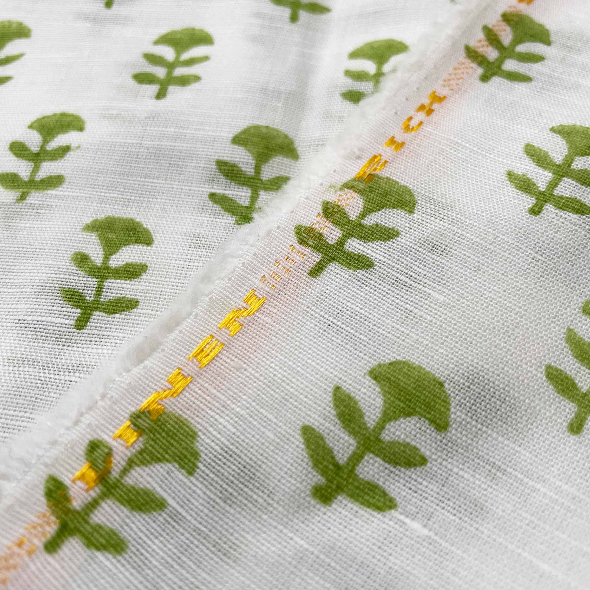 Off White linen fabric with Sage Green tiny flowers printed on it.  The fabric is hand block printed one wooden block at a time.