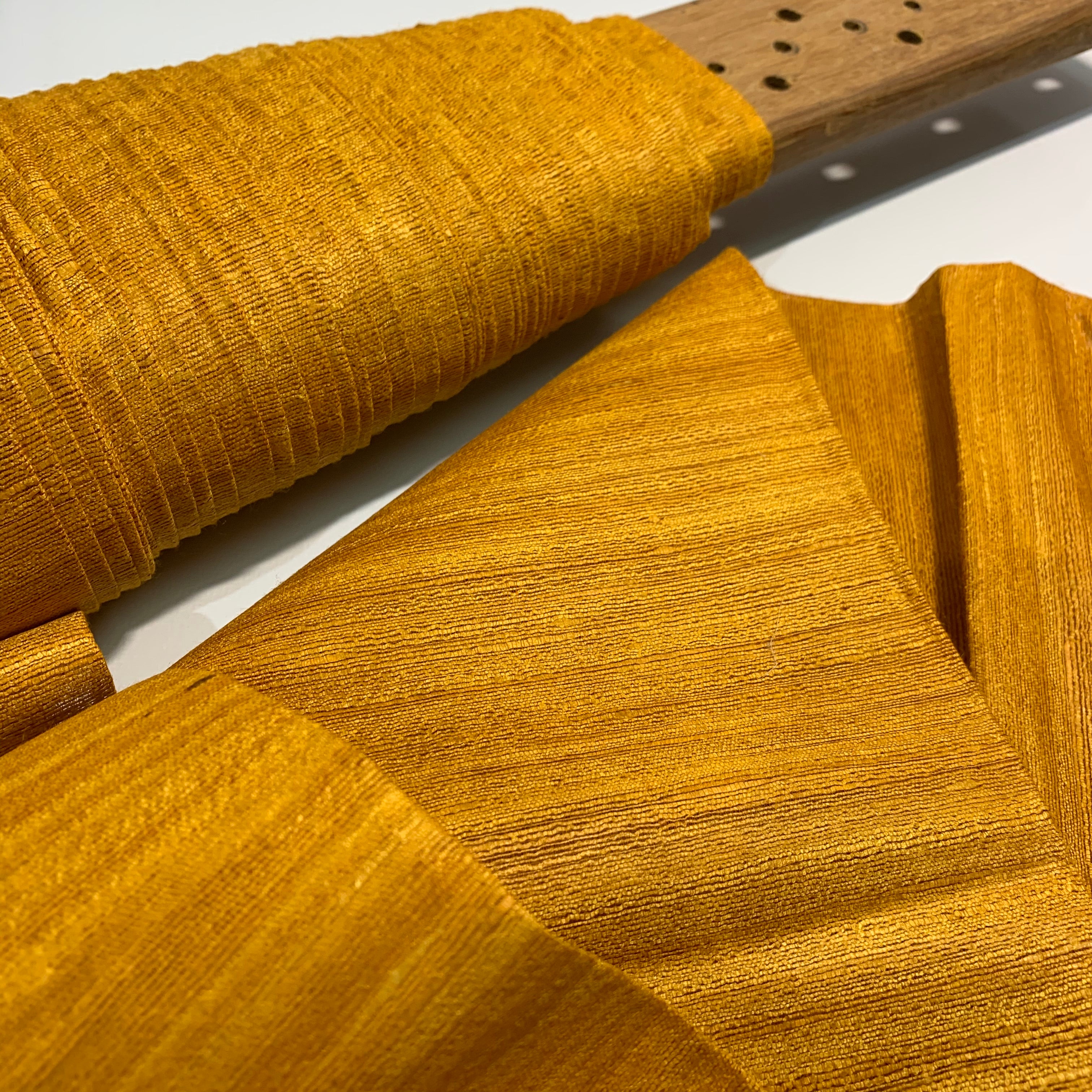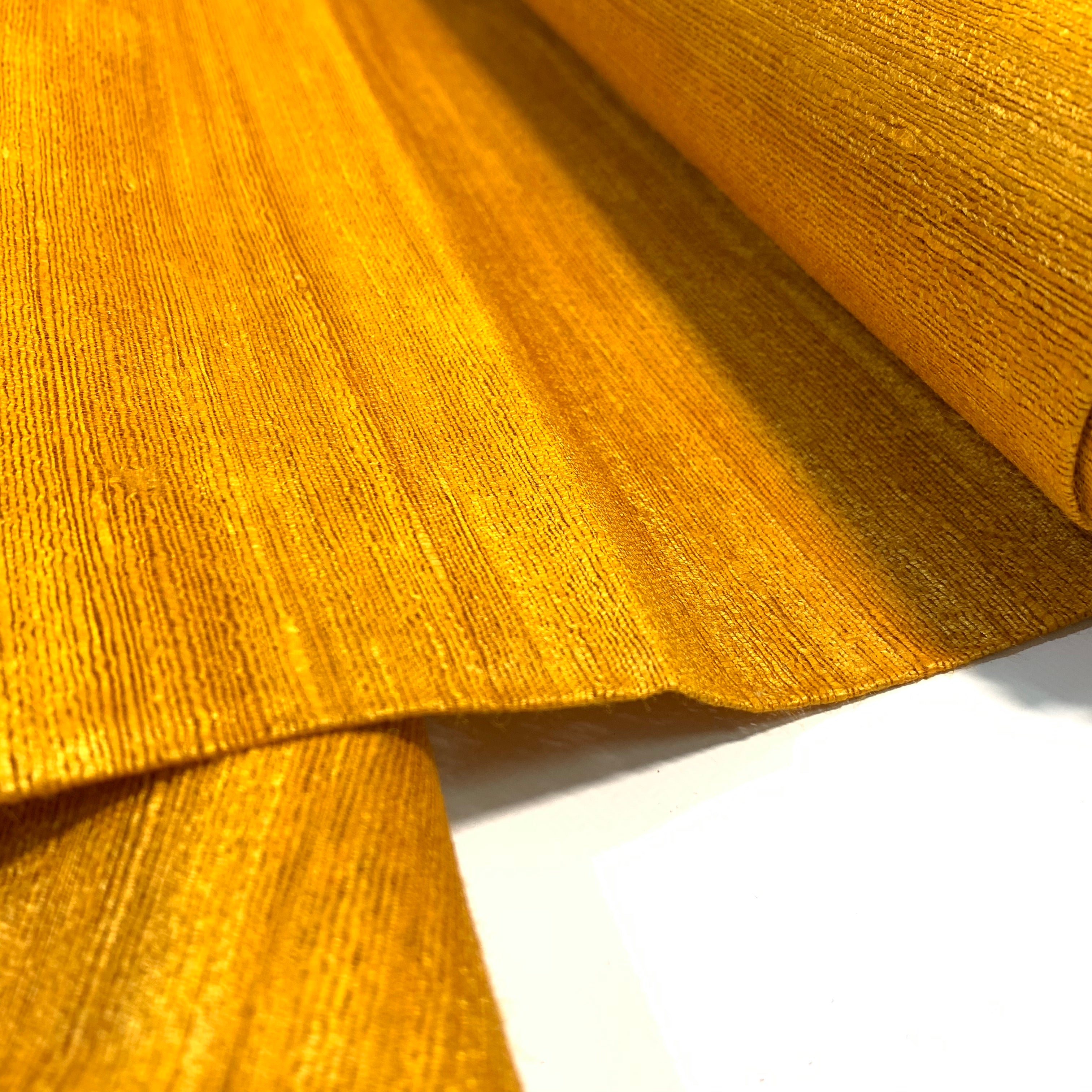 Mustard pure dupioni silk fabric. This is 100% pure silk dupioni obtained from Indian mulberry cocoon's silk yarn. The fabric is obtained without harming the larvae that is inside the cocoon (thus called the ahimsa fabric). The fabric has lot of texture and has a rather unique finish.