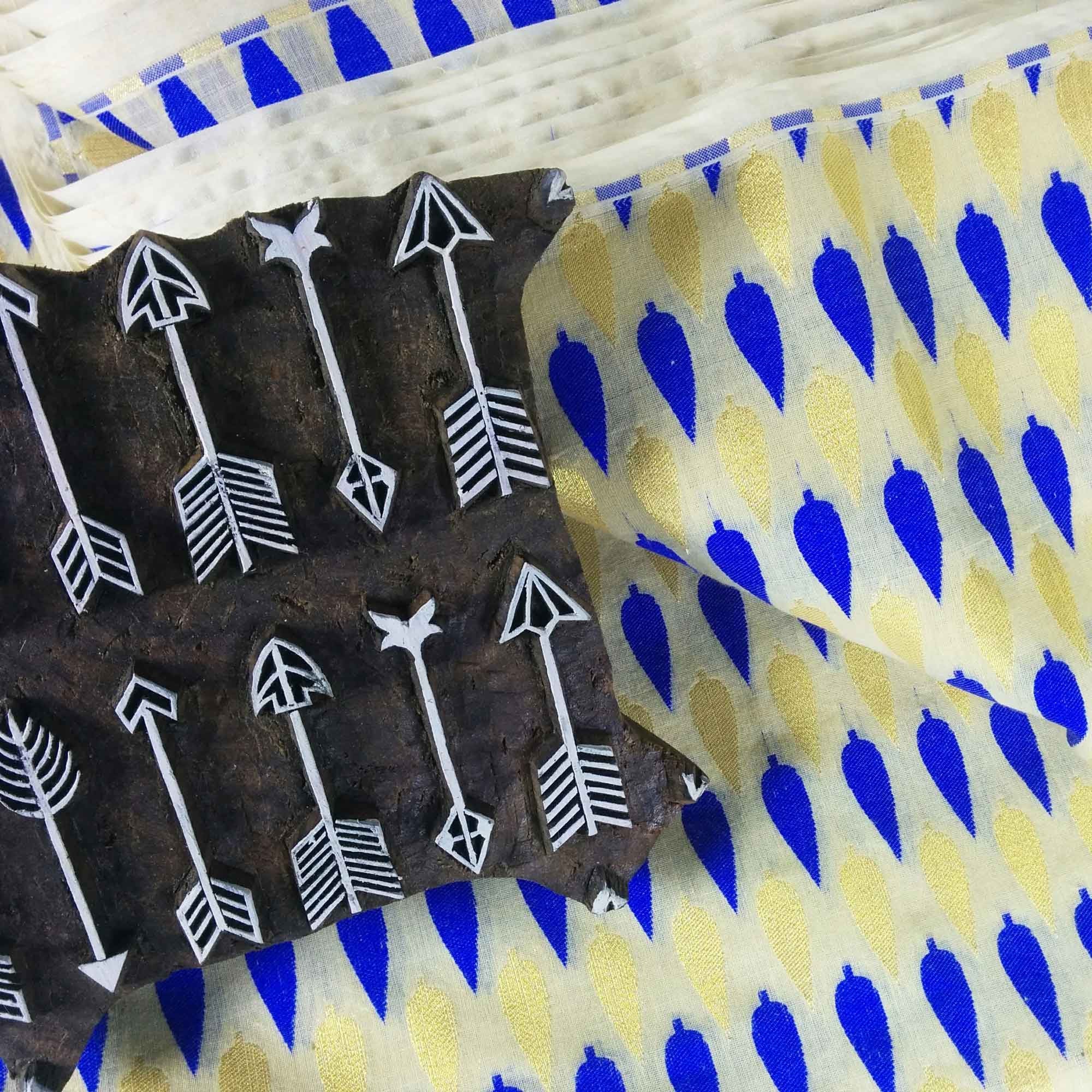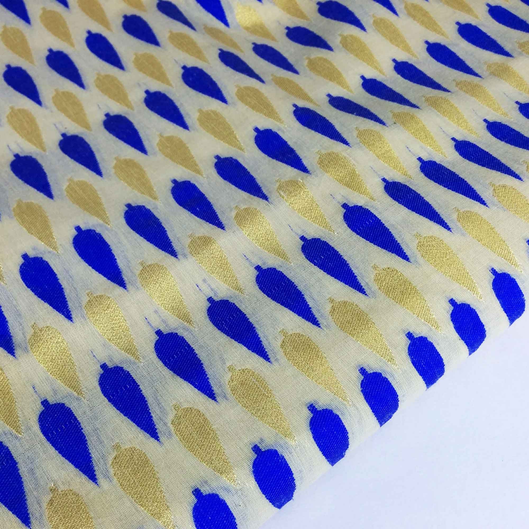 Tear drop pattern royal blue, beige and gold chanderi silk fabric. The fabric is hadmade on a loom in Chanderi village of Madhya Pradesh. This cotton and silk mixed fabric. This is very light weight and breathable fabric, good for summers too.