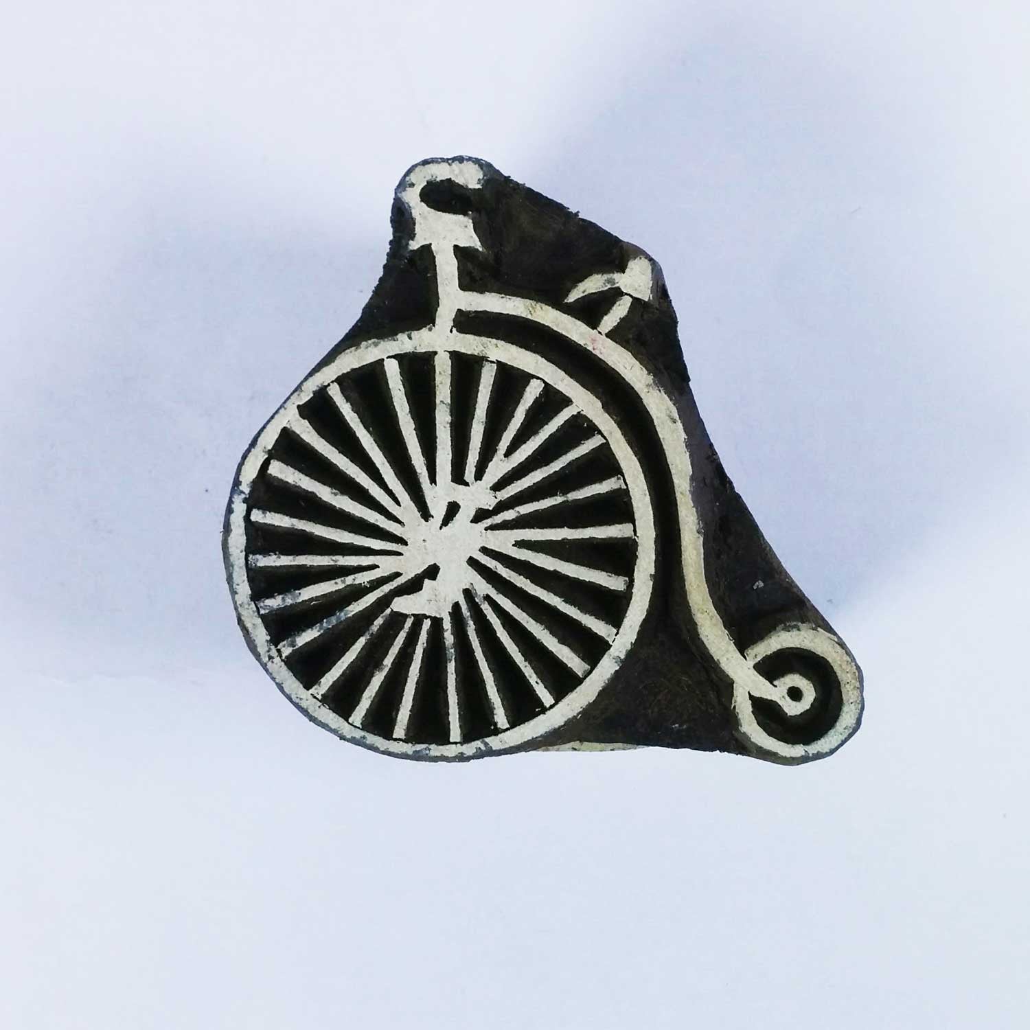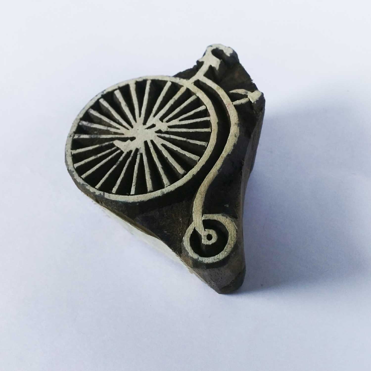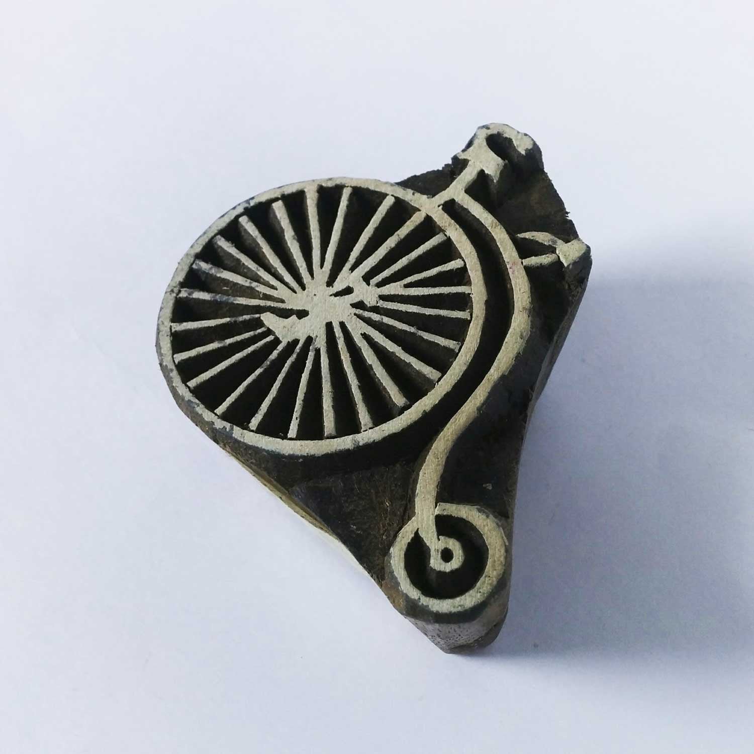 Wood block printing stamp - cycle with intricate carving.