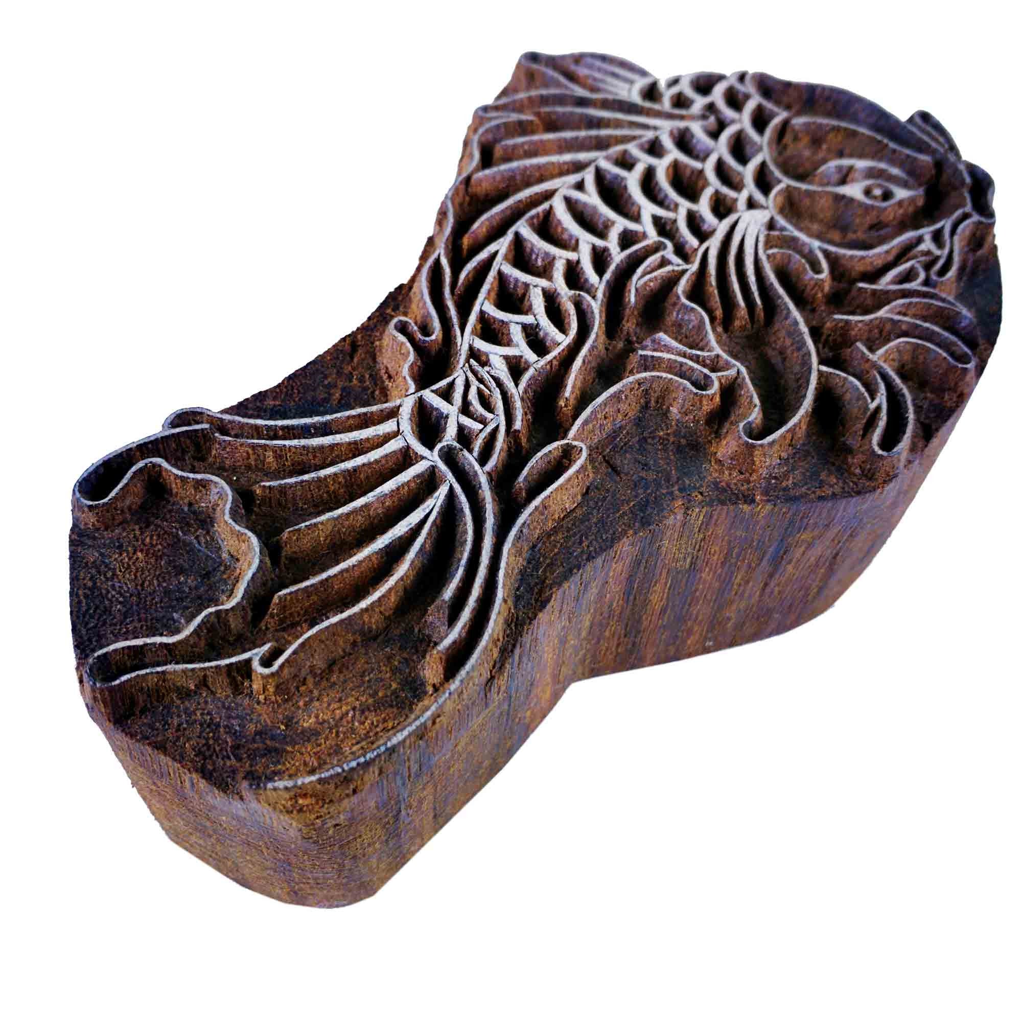 Wood block printing stamp - fish with intricate carving.
