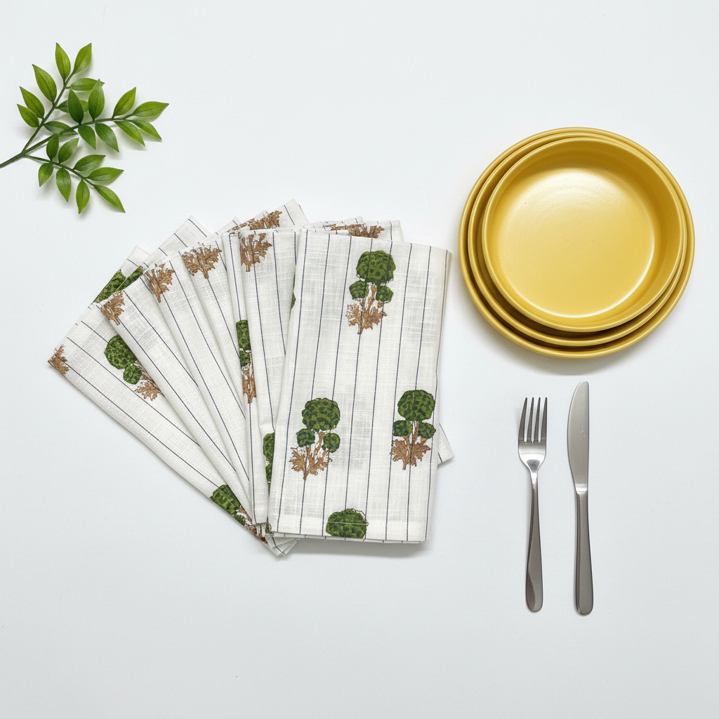 Linen Dinner Napkin Set includes four hand block printed napkins in green on soft white fabric with very thin blue stripes detail. Carefully crafted with attention to detail, these napkins bring a perfect balance of timeless elegance and sustainable craftsmanship to any table. Their refined design makes them suitable for both everyday dining and special occasions.