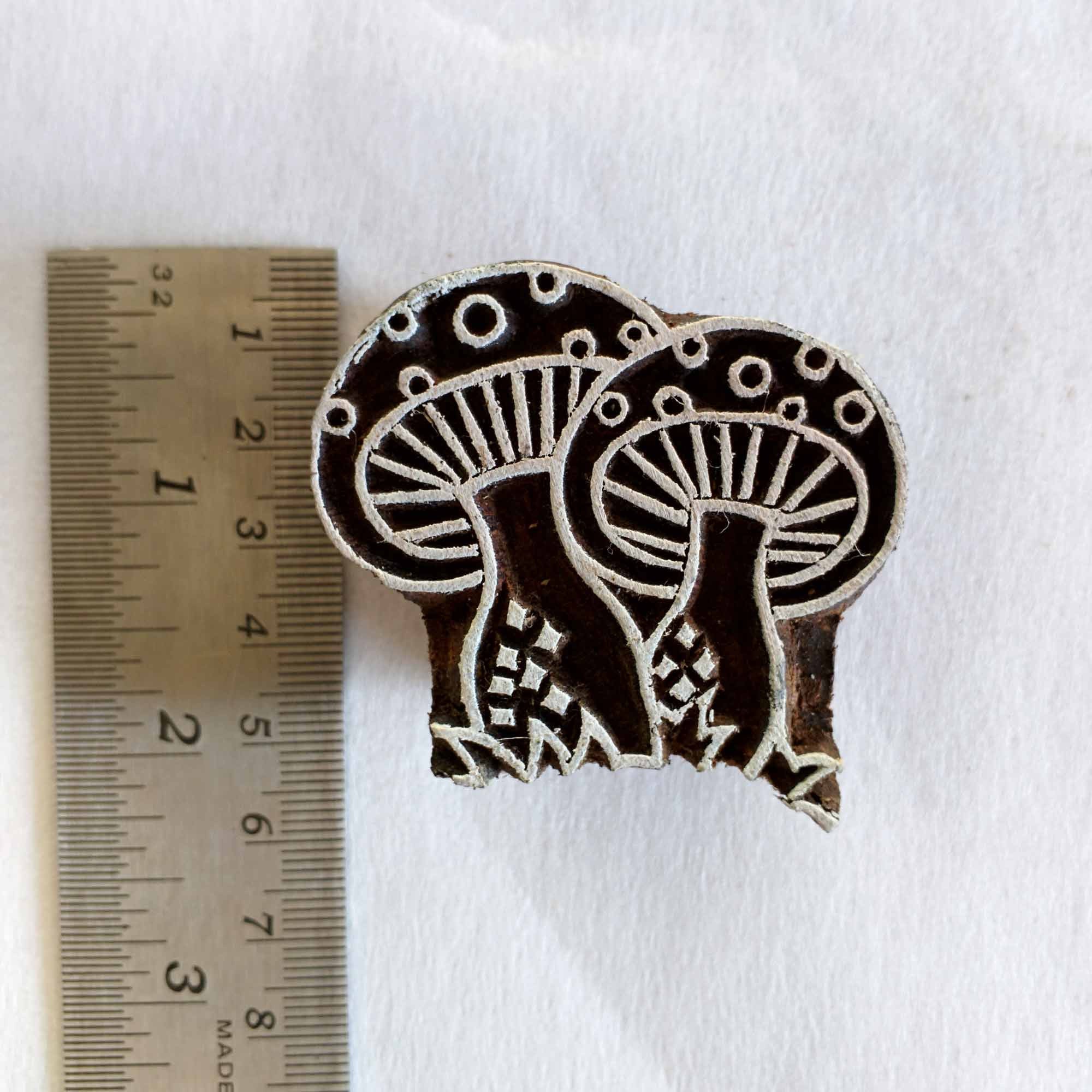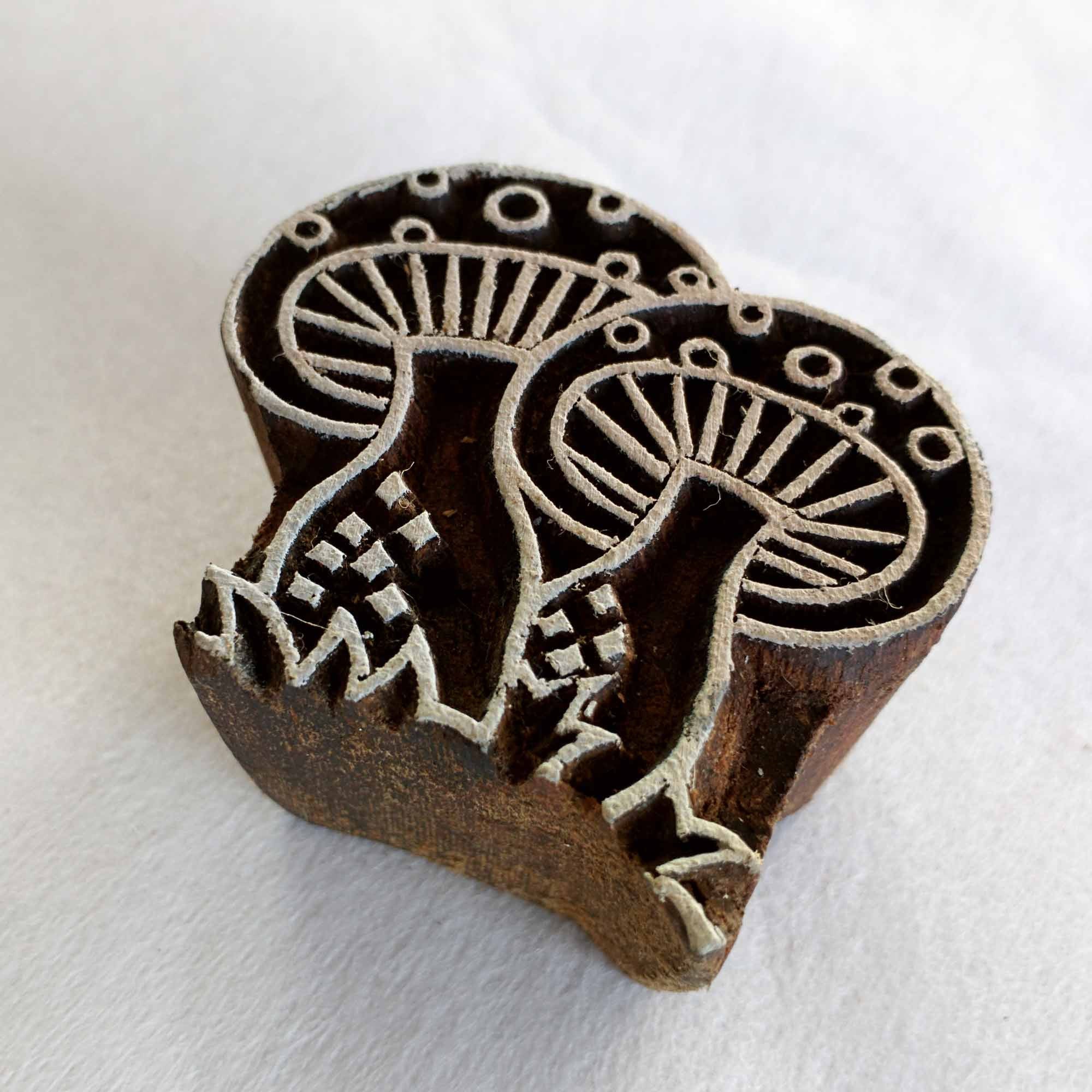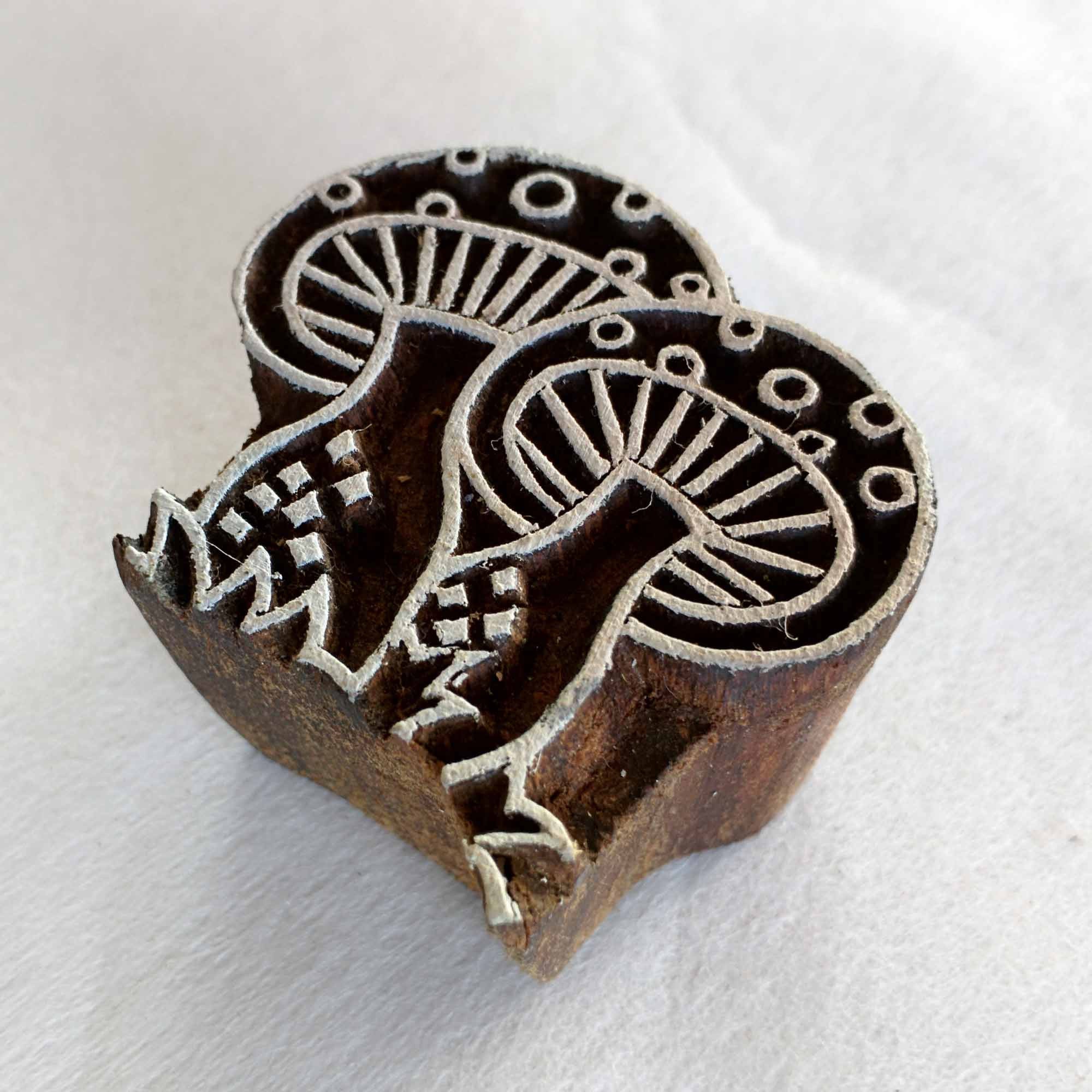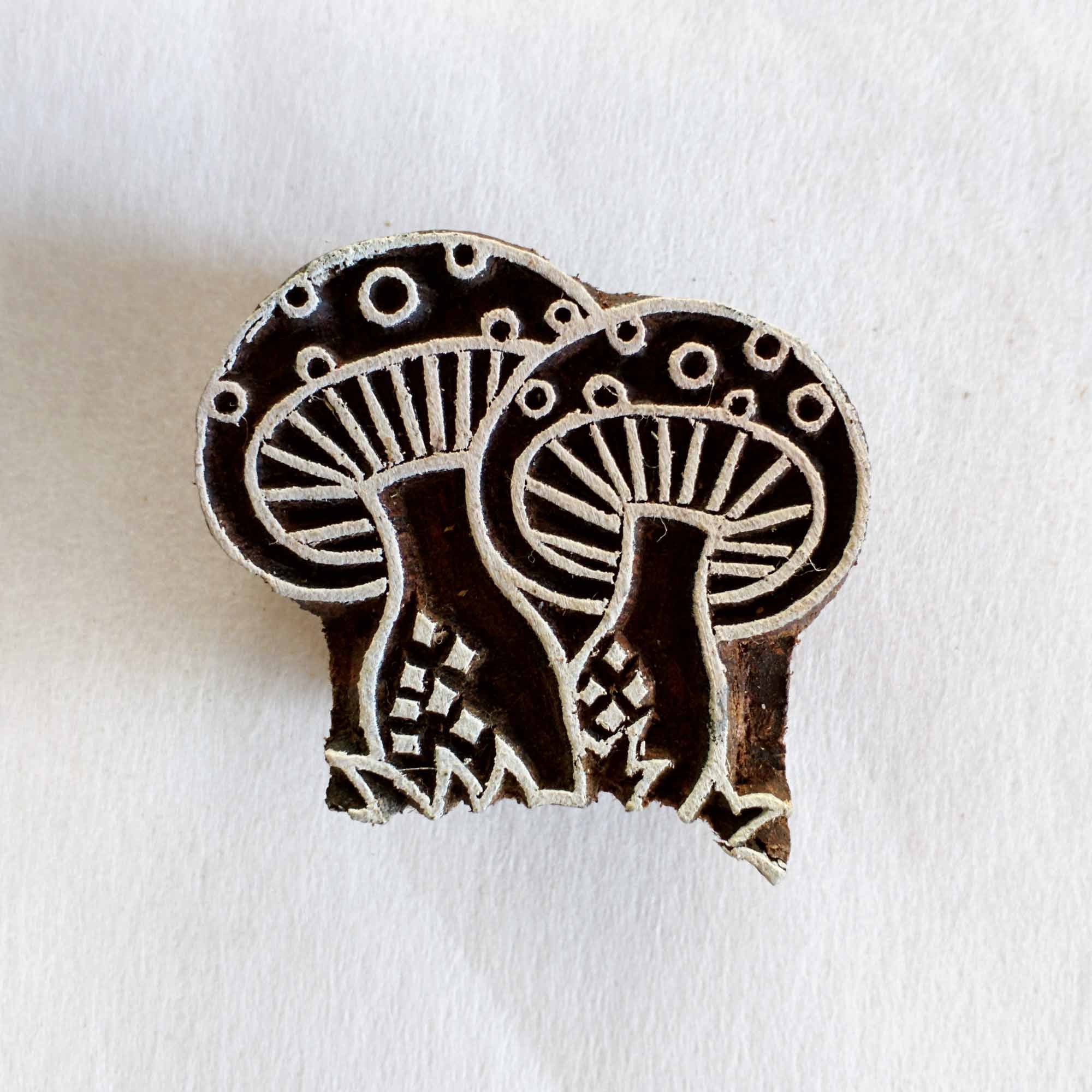 Wood block printing stamp - Kawaii mushrooms with intricate carving.