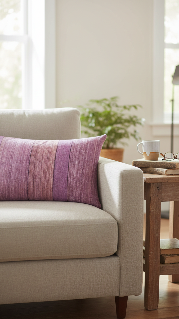 This handwoven tussar silk pillow cover combines timeless elegance with artisanal quality. Crafted from 100% pure organic tussar silk (also known as tussah silk), the lavender and purple striped detail with texture adds visual depth and sophistication to any room.