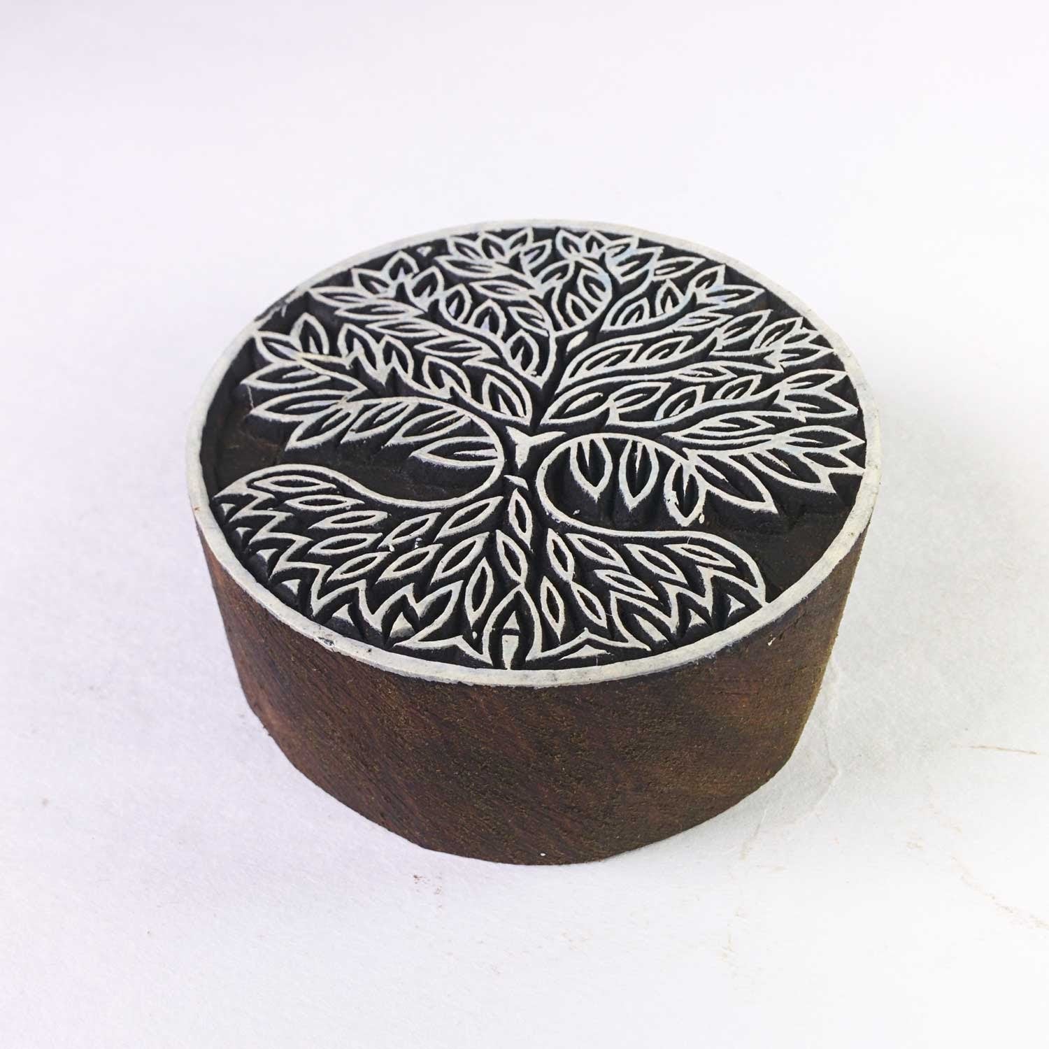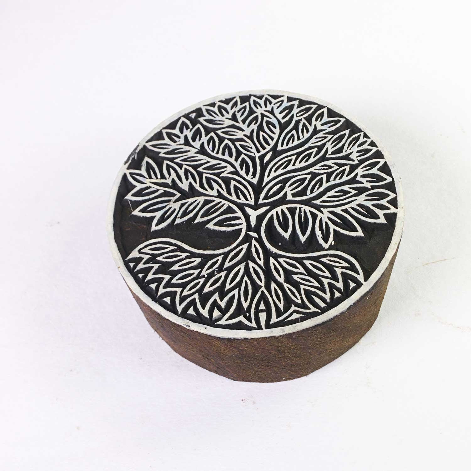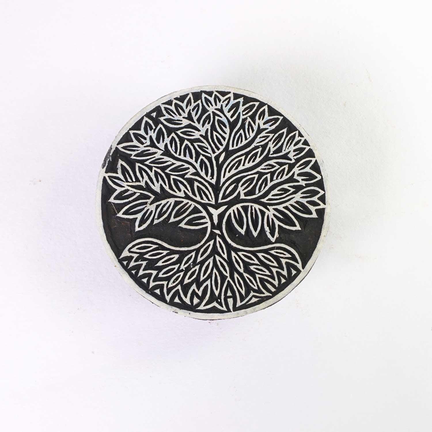 Wood block printing stamp - tree of life in a mandala with intricate carving.