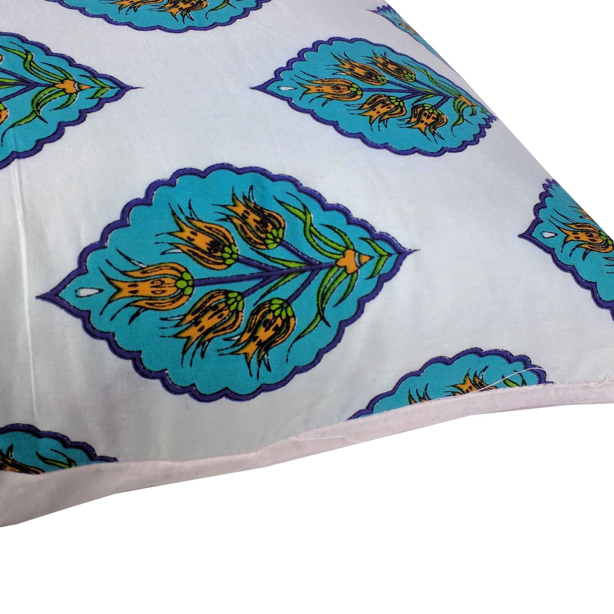 Printed cotton cushion cover in white and teal floral damask. 100% cotton pillow cover has a soft cotton lining that is well interlocked to avoid any fraying use-after-use.